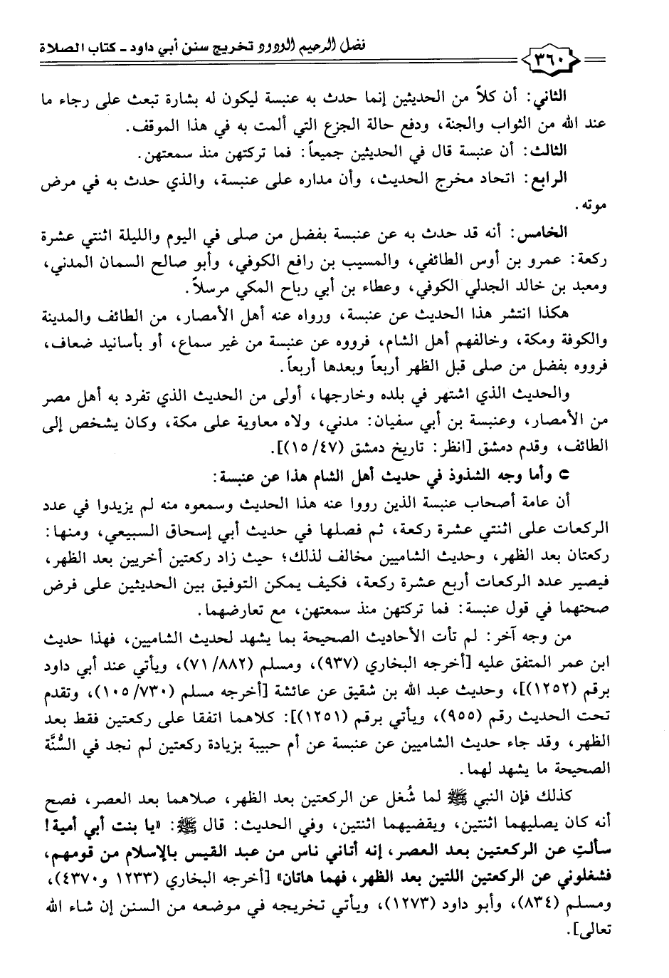 من وجه آخر: لم تأت الأحاديث الصحيحة بما يشهد لحديث الشاميين، فهذا حديث ابن عمر المتفق عليه [أخرجه البخاري (٩٣٧)، ومسلم (٨٨٢/ ٧١)، ويأتي عند أبى داود برقم (١٢٥٢)]، وحديث عبد الله بن شقيق عن عائشة [أخرجه مسلم (٧٣٠/ ١٠٥)، وتقدم تحت الحديث رقم (٩٥٥)، ويأتي برقم (١٢٥١)]: كلاهما اتفقا على ركعتين فقط بعد الظهر، وقد جاء حديث الشاميين عن عنبسة عن أم حبيبة بزيادة ركعتين لم نجد في السُّنَّة الصحيحة ما يشهد لهما.