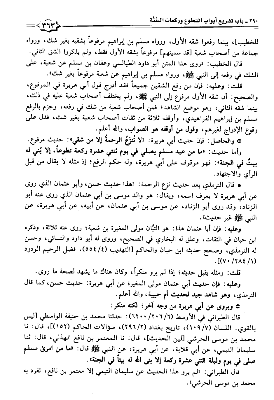 وأما حديث: "ما من عبد مسلم يصلي في يوم ثنتي عشرة ركعة تطوعًا، إلا بُني له بيتٌ في الجنة": فهو موقوف على أبى هريرة، وله حكم الرفع؛ إذ مثله لا يقال من قبل الرأي والاجتهاد.