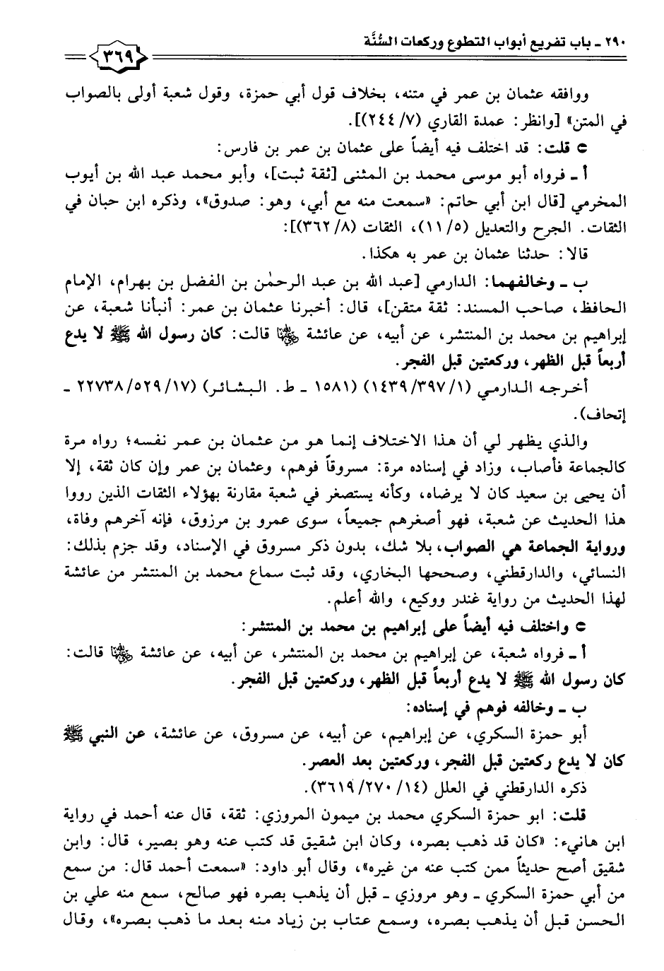 ب - وخالفهما: الدارمي [عبد الله بن عبد الرحمن بن الفضل بن بهرام، الإمام الحافظ، صاحب المسند: ثقة متقن]، قال: أخبرنا عثمان بن عمر: أنبأنا شعبة، عن إبراهيم بن محمد بن المنتشر، عن أبيه، عن عائشة - رضي الله عنها - قالت: كان رسول الله - صلى الله عليه وسلم - لا يدع أربعًا قبل الظهر، وركعتين قبل الفجر.