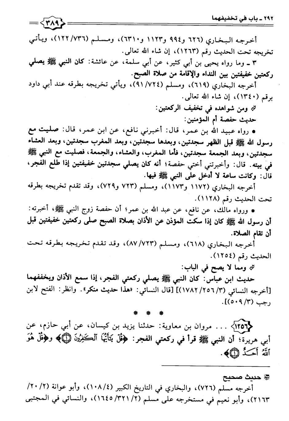 • رواه عبيد الله بن عمر، قال: أخبرني نافع، عن ابن عمر، قال: صليت مع رسول الله - صلى الله عليه وسلم - قبل الظهر سجدتين، وبعدها سجدتين، وبعد المغرب سجدتين، وبعد العشاء سجدتين، وبعد الجمعة سجدتين، فأما المغرب، والعشاء، والجمعة، فصليت مع النبي - صلى الله عليه وسلم - في بيته. قال: وأخبرتني أختي حفصة؛ أنه كان يصلي سجدتين خفيفتين إذا طلع الفجر، قال: وكانت ساعة لا أدخل على النبي - صلى الله عليه وسلم - فيها.
