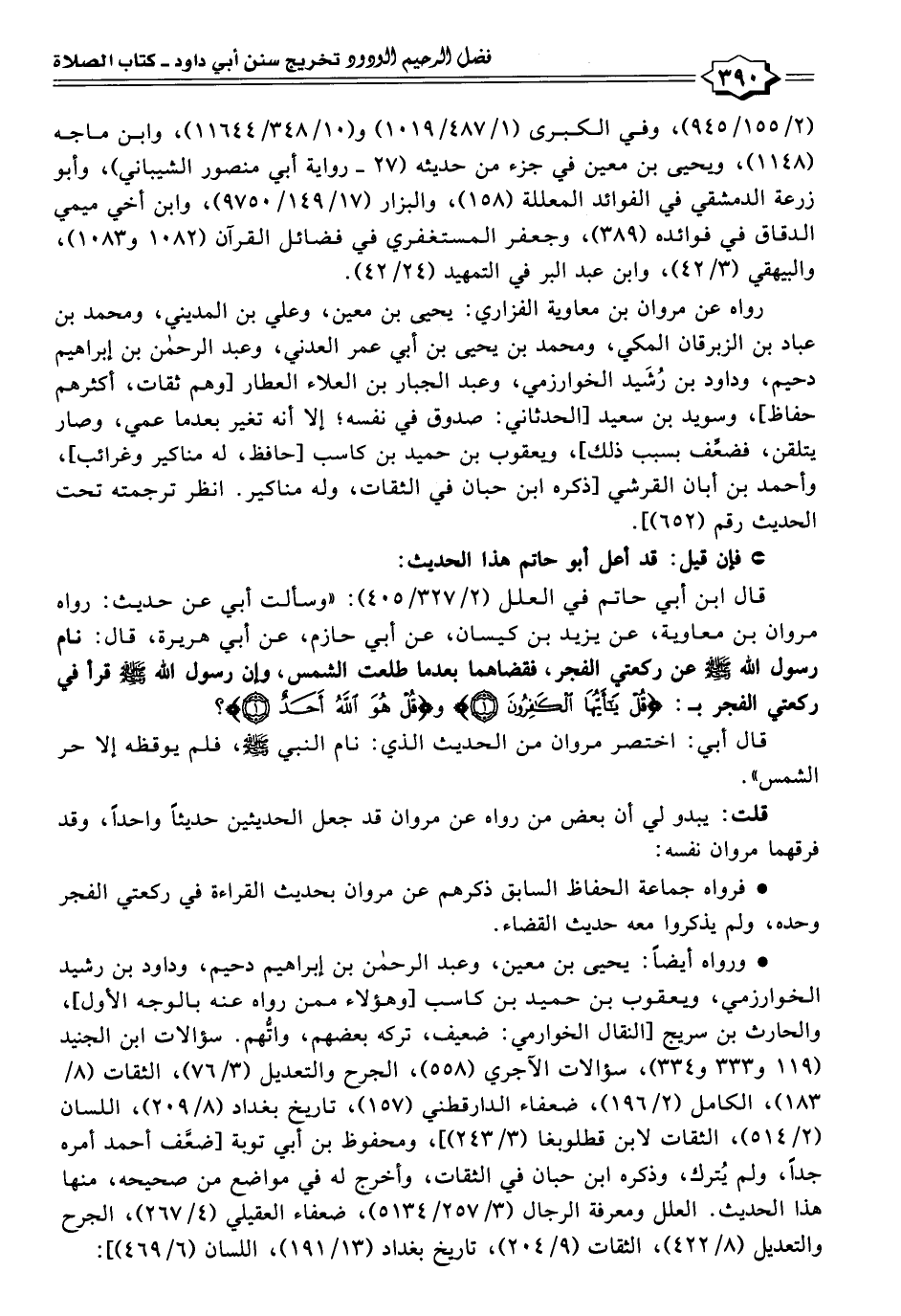 قال ابن أبي حاتم في العلل (٢/ ٣٢٧/ ٤٠٥): "وسألت أبي عن حديث: رواه مروان بن معاوية، عن يزيد بن كيسان، عن أبي حازم، عن أبي هريرة، قال: نام رسول الله - صلى الله عليه وسلم - عن ركعتي الفجر، فقضاهما بعدما طلعت الشمس، وإن رسول الله - صلى الله عليه وسلم - قرأ في ركعتي الفجر بـ: {قُلْ يَاأَيُّهَا الْكَافِرُونَ (١)} و {قُلْ هُوَ اللَّهُ أَحَدٌ (١)}؟