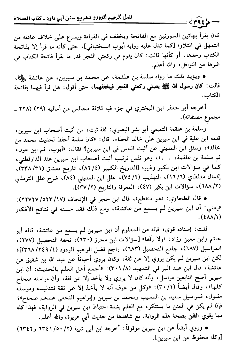 • ويؤيد ذلك ما رواه سلمة بن علقمة، عن محمد بن سيرين، عن عائشة - رضي الله عنها -، قالت: كان رسول الله - صلى الله عليه وسلم - يصلي ركعتي الفجر فيخففهما، حتى أقول: هل قرأ فيهما بفاتحة الكتاب.