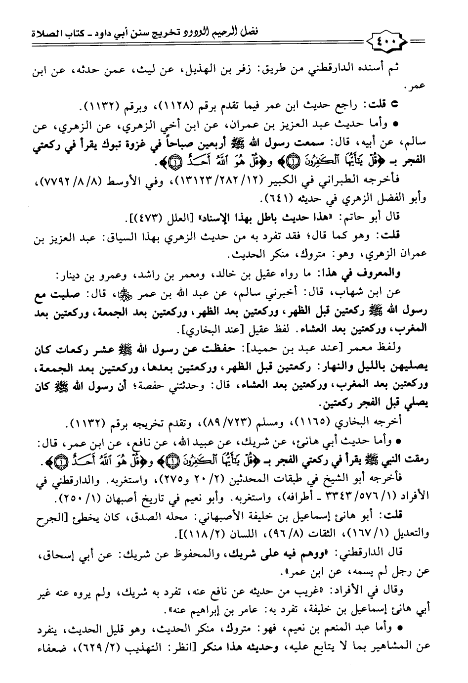 • وأما حديث عبد العزيز بن عمران، عن ابن أخي الزهري، عن الزهري، عن سالم، عن أبيه، قال: سمعت رسول الله - صلى الله عليه وسلم - أربعين صباحًا في غزوة تبوك يقرأ في ركعتي الفجر بـ {قُلْ يَاأَيُّهَا الْكَافِرُونَ (١)} و {قُلْ هُوَ اللَّهُ أَحَدٌ (١)}.