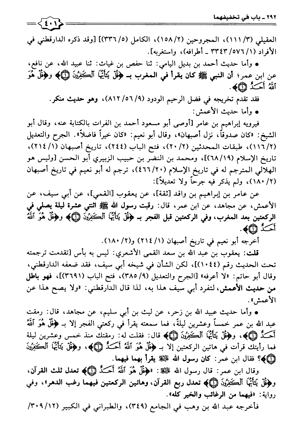 عن عامر بن إبراهيم بن واقد [ثقة]، عن يعقوب [القمي]، عن أبي سيف، عن الأعمش، عن مجاهد، عن ابن عمر، قال: رقبت رسول الله - صلى الله عليه وسلم - اثنتي عشرة ليلة يصلي في الركعتين بعد المغرب، وفي الركعتين قبل الفجر بـ {قُلْ يَاأَيُّهَا الْكَافِرُونَ (١)} و {قُلْ هُوَ اللَّهُ أَحَدٌ (١)}.