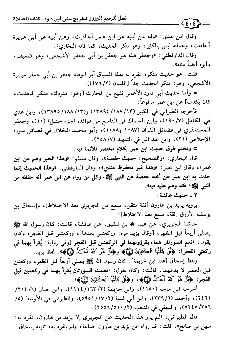 ولفظ إسحاق [عند ابن خزيمة]: كان رسول الله - صلى الله عليه وسلم - يصلي أربعًا قبل الظهر، وركعتين قبل العصر لا يدعهما، قالت: وكان يقول: "نعمت السورتان يُقرأ بهما في ركعتين قبل الفجر: {قُلْ هُوَ اللَّهُ أَحَدٌ (١)}، و {قُلْ يَاأَيُّهَا الْكَافِرُونَ (١)} ".