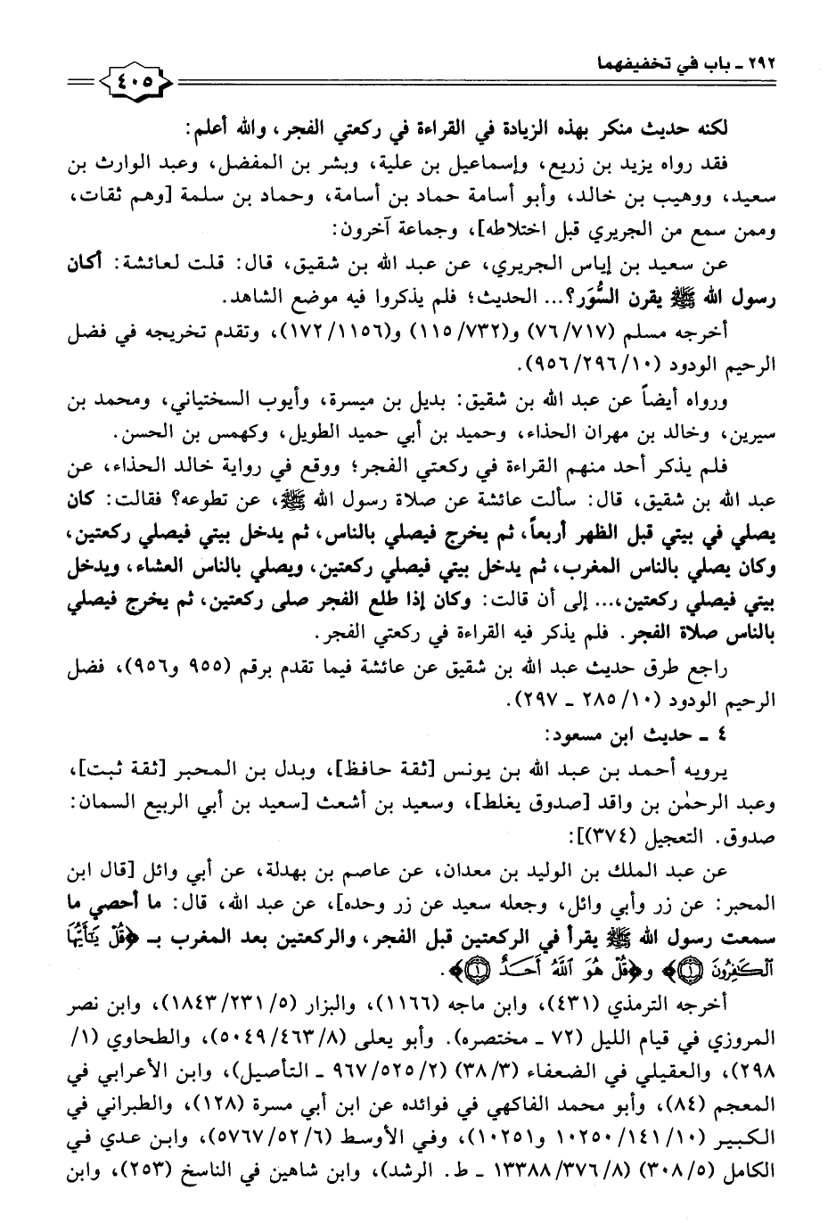 عن عبد الملك بن الوليد بن معدان، عن عاصم بن بهدلة، عن أبي وائل [قال ابن المحبر: عن زر وأبي وائل، وجعله سعيد عن زر وحده]، عن عبد الله، قال: ما أحصي ما سمعت رسول الله - صلى الله عليه وسلم - يقرأ في الركعتين قبل الفجر، والركعتين بعد المغرب بـ {قُلْ يَاأَيُّهَا الْكَافِرُونَ (١)} و {قُلْ هُوَ اللَّهُ أَحَدٌ (١)}.