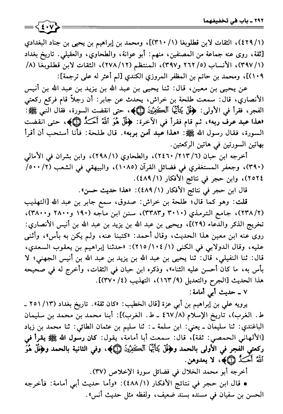 يرويه علي بن إبراهيم بن أبي عزة [قال الخطيب: "كان ثقة". تاريخ بغداد (١٣/ ٢٥١ - ط. الغرب)، تاريخ الإسلام (٨/ ٤٦٧ - ط. الغرب)]: أبنا محمد بن محمد بن سليمان الباغندي: ثنا سليمان - يعني: ابن سلمة -: ثنا سليم بن عثمان الطائي: ثنا محمد بن زياد [الألهاني الحمصي: ثقة]، قال: سمعت أبا أمامة، يقول: كان رسول الله - صلى الله عليه وسلم - يقرأ في ركعتي الفجر في الأولى بالحمد و {قُلْ يَاأَيُّهَا الْكَافِرُونَ (١)}، وفي الثانية بالحمد و {قُلْ هُوَ اللَّهُ أَحَدٌ (١)}، لا يعدوهن.