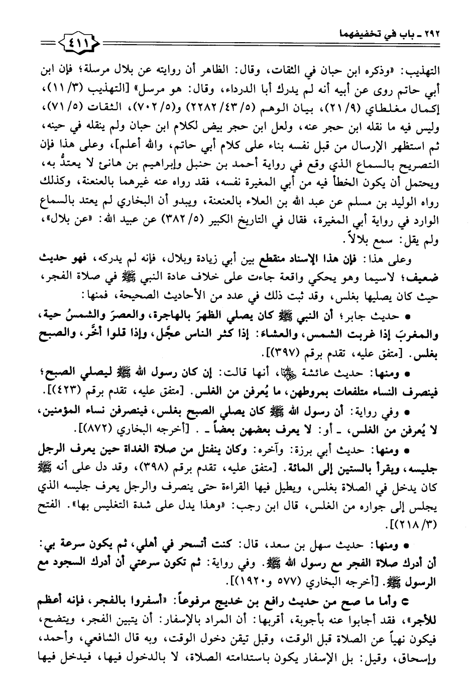 * ومنها: حديث أبي برزة: وآخره: وكان ينفتل من صلاة الغداة حين يعرف الرجل جليسه، ويقرأ بالستين إلى المائة. [متفق عليه، تقدم برقم (٣٩٨)، وقد دل على أنه - صلى الله عليه وسلم - كان يدخل في الصلاة بغلس، ويطيل فيها القراءة حتى ينصرف والرجل يعرف جليسه الذي يجلس إلى جواره من الغلس، قال ابن رجب: "وهذا يدل على شدة التغليس بها". الفتح (٣/ ٢١٨)].