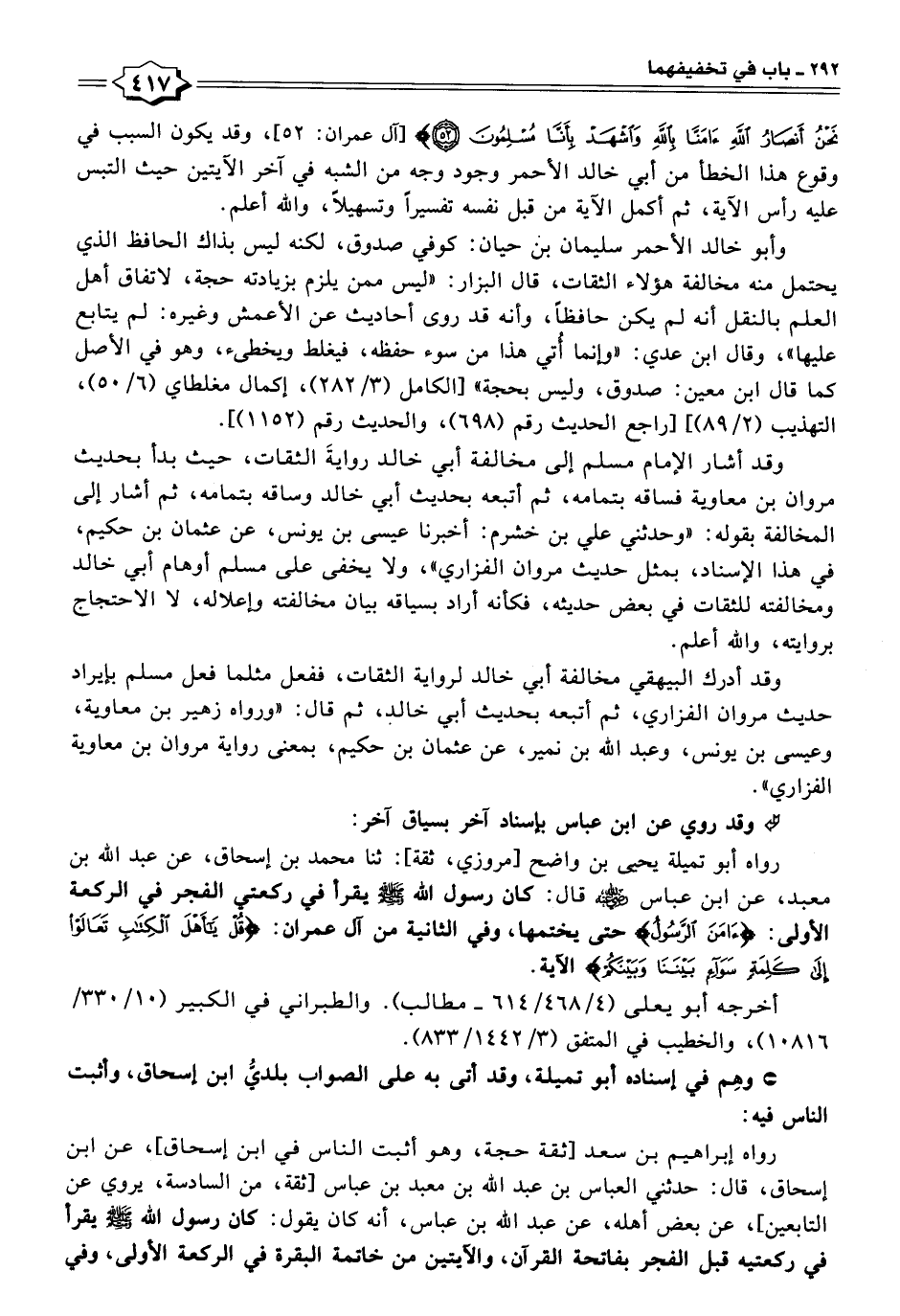 رواه إبراهيم بن سعد [ثقة حجة، وهو أثبت الناس في ابن إسحاق]، عن ابن إسحاق، قال: حدثني العباس بن عبد الله بن معبد بن عباس [ثقة، من السادسة، يروي عن التابعين]، عن بعض أهله، عن عبد الله بن عباس، أنه كان يقول: كان رسول الله - صلى الله عليه وسلم - يقرأ في ركعتيه قبل الفجر بفاتحة القرآن، والآيتين من خاتمة البقرة في الركعة الأولى، وفي