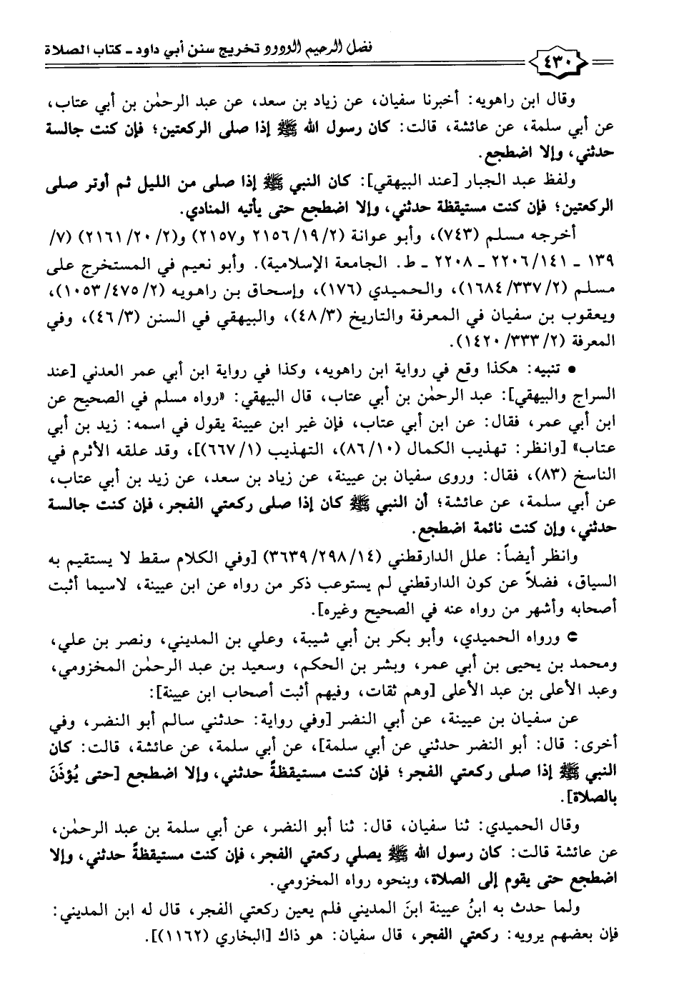 * تنبيه: هكذا وقع في رواية ابن راهويه، وكذا في رواية ابن أبي عمر العدني [عند السراج والبيهقي]: عبد الرحمن بن أبي عتاب، قال البيهقي: "رواه مسلم في الصحيح عن ابن أبي عمر، فقال: عن ابن أبي عتاب، فإن غير ابن عيينة يقول في اسمه: زيد بن أبي عتاب" [وانظر: تهذيب الكمال (١٠/ ٨٦)، التهذيب (١/ ٦٦٧)]، وقد علقه الأثرم في الناسخ (٨٣)، فقال: وروى سفيان بن عيينة، عن زياد بن سعد، عن زيد بن أبي عتاب، عن أبي سلمة، عن عائشة؛ أن النبي - صلى الله عليه وسلم - كان إذا صلى ركعتي الفجر، فإن كنت جالسة حدثني، وإن كنت نائمة اضطجع.