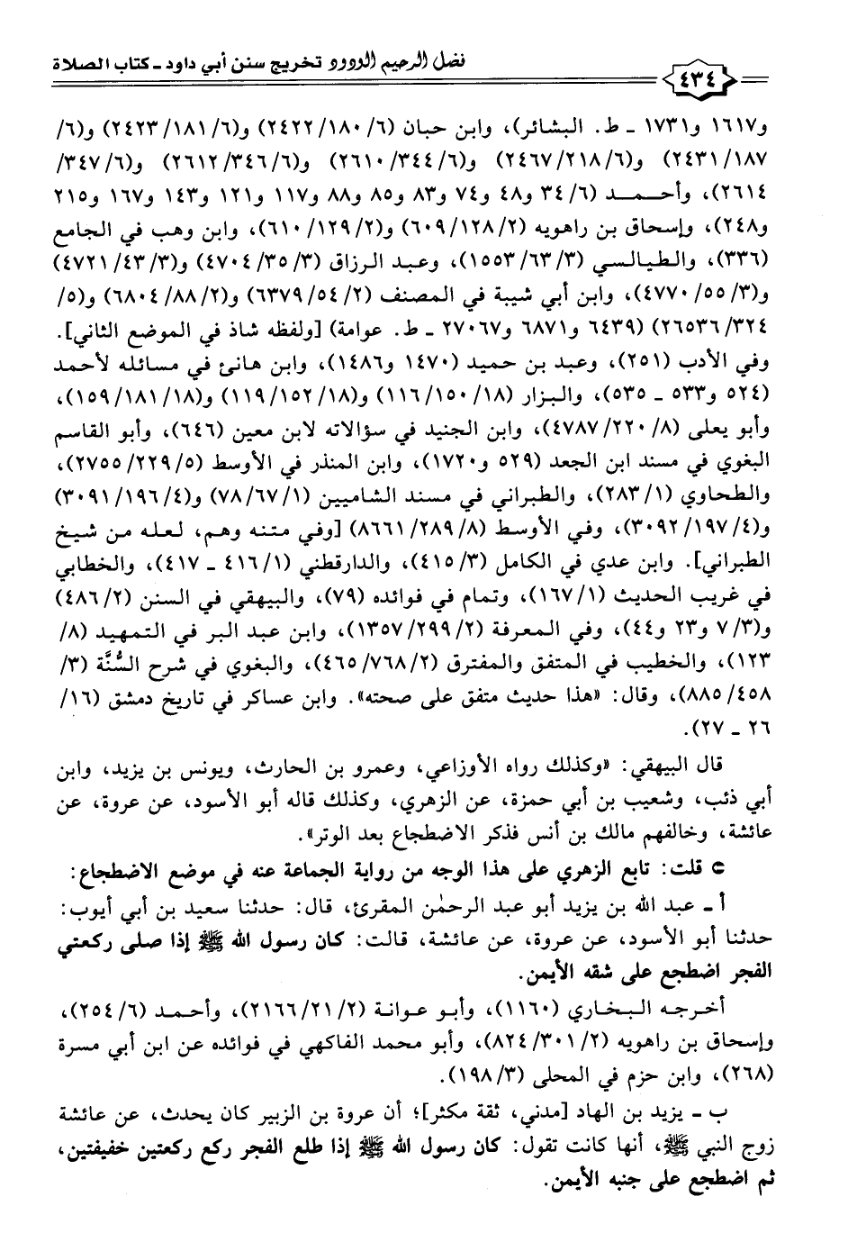 أ - عبد الله بن يزيد أبو عبد الرحمن المقرئ، قال: حدثنا سعيد بن أبي أيوب: حدثنا أبو الأسود، عن عروة، عن عائشة، قالت: كان رسول الله - صلى الله عليه وسلم - إذا صلى ركعتي الفجر اضطجع على شقه الأيمن.