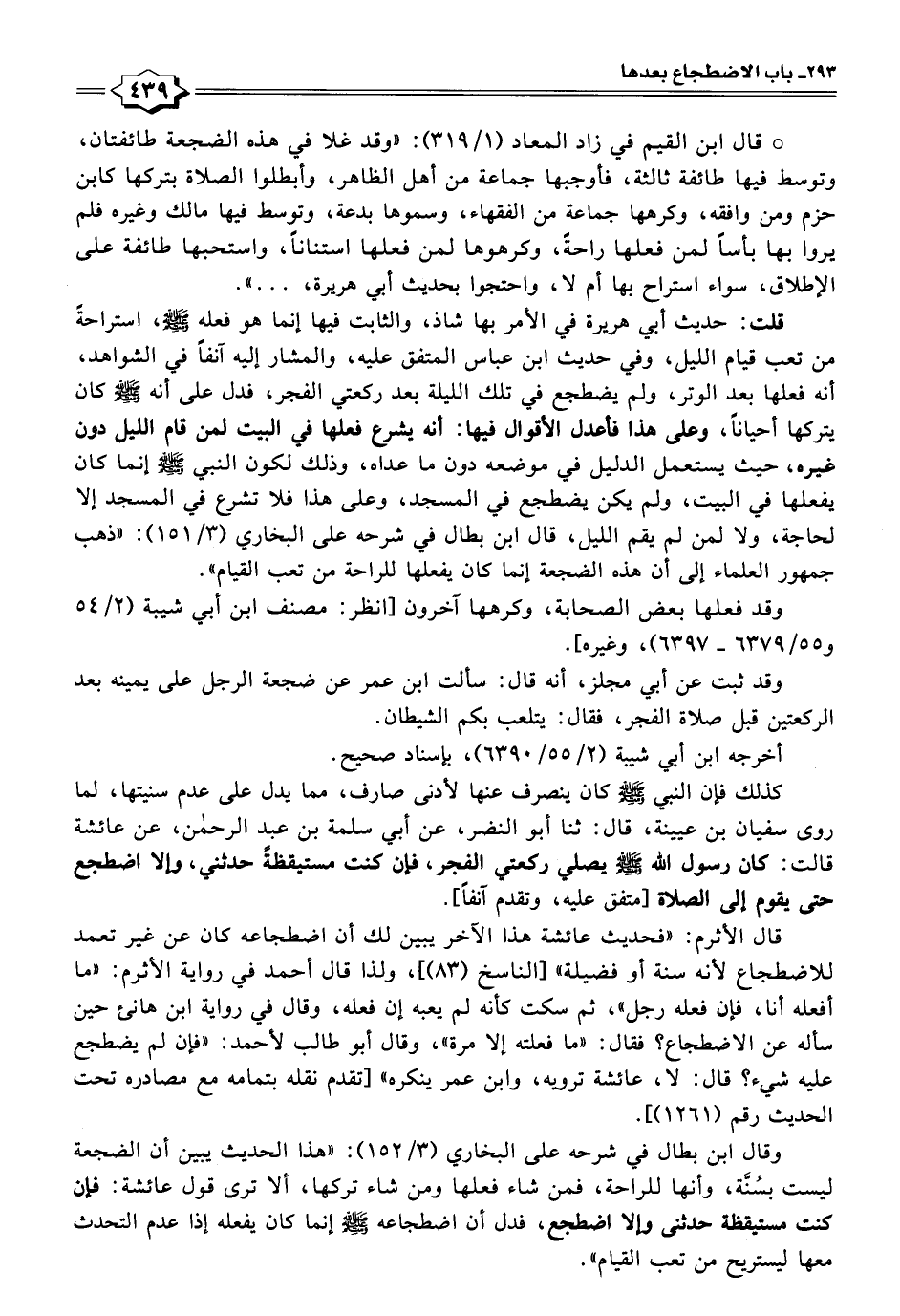 * قال ابن القيم في زاد المعاد (١/ ٣١٩): "وقد غلا في هذه الضجعة طائفتان، وتوسط فيها طائفة ثالثة، فأوجبها جماعة من أهل الظاهر، وأبطلوا الصلاة بتركها كابن حزم ومن وافقه، وكرهها جماعة من الفقهاء، وسموها بدعة، وتوسط فيها مالك وغيره فلم يروا بها بأسًا لمن فعلها راحةً، وكرهوها لمن فعلها استنانًا، واستحبها طائفة على الإطلاق، سواء استراح بها أم لا، واحتجوا بحديث أبي هريرة، ... ".