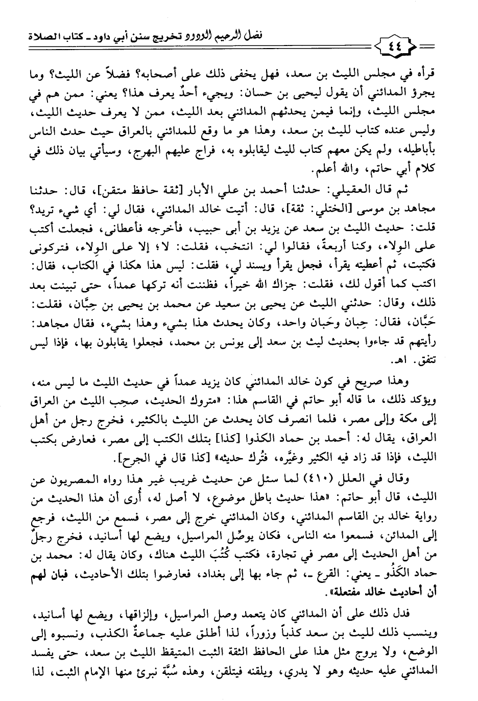 فدل ذلك على أن المدائني كان يتعمد وصل المراسيل، وإلزاقها، ويضع لها أسانيد، وينسب ذلك لليث بن سعد كذبًا وزورًا، لذا أطلق عليه جماعةٌ الكذب، ونسبوه إلى الوضع، ولا يروج مثل هذا على الحافظ الثقة الثبت المتيقظ الليث بن سعد، حتى يفسد المدائني عليه حديثه وهو لا يدري، ويلقنه فيتلقن، وهذه سُبَّة نبرئ منها الإمام الثبت، لذا