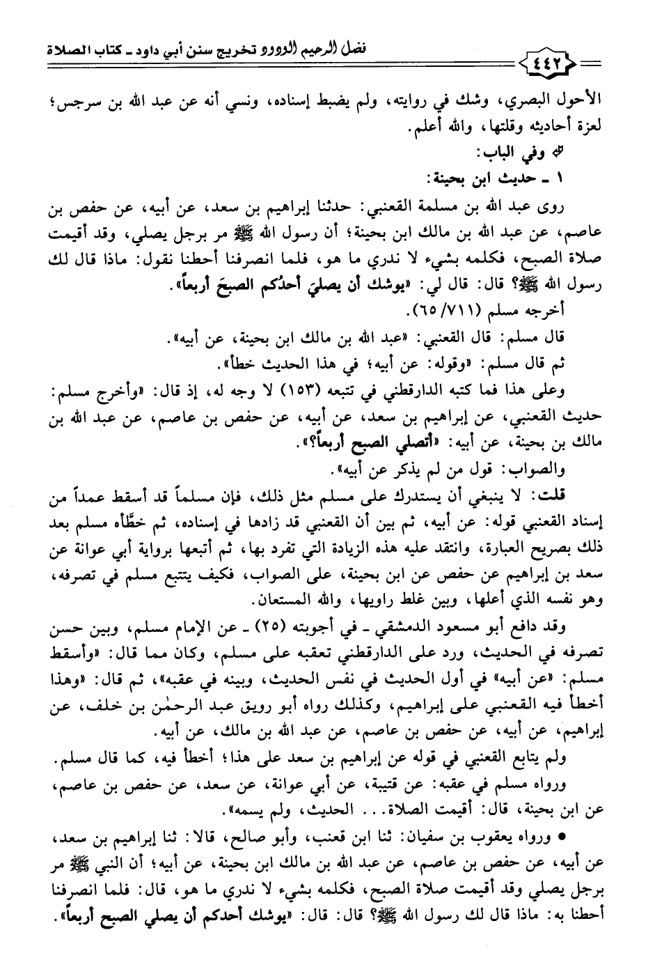 وعلى هذا فما كتبه الدارقطني في تتبعه (١٥٣) لا وجه له، إذ قال: "وأخرج مسلم: حديث القعنبي، عن إبراهيم بن سعد، عن أبيه، عن حفص بن عاصم، عن عبد الله بن مالك بن بحينة، عن أبيه: "أتصلي الصبح أربعًا؟ ".