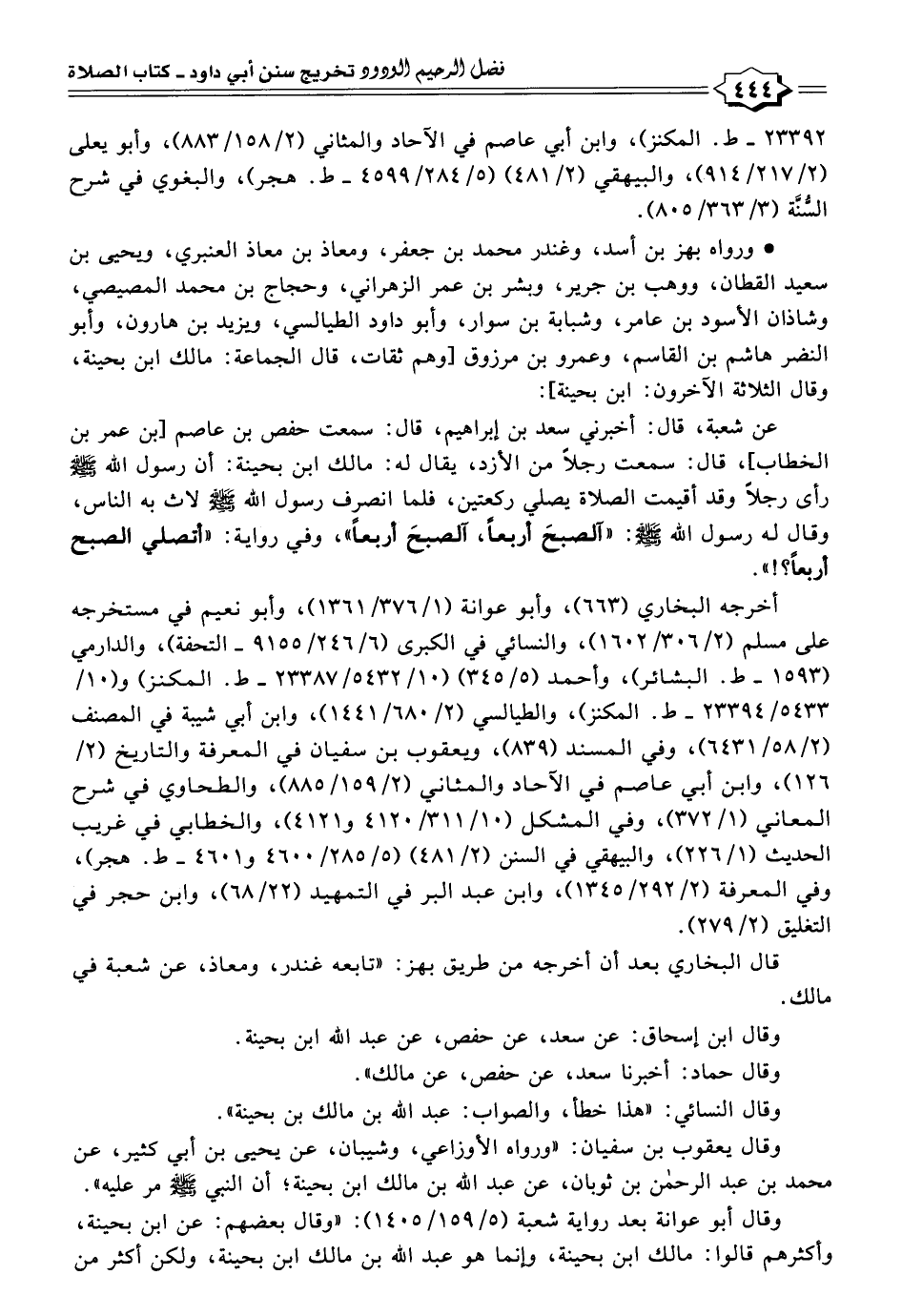 عن شعبة، قال: أخبرني سعد بن إبراهيم، قال: سمعت حفص بن عاصم [بن عمر بن الخطاب]، قال: سمعت رجلًا من الأزد، يقال له: مالك بن بحينة: أن رسول الله - صلى الله عليه وسلم - رأى رجلًا وقد أقيمت الصلاة يصلي ركعتين، فلما انصرف رسول الله - صلى الله عليه وسلم - لاث به الناس، وقال له رسول الله - صلى الله عليه وسلم -: "آلصبحَ أربعًا، آلصبحَ أربعًا"، وفي رواية: "أتصلي الصبح أربعًا؟! ".