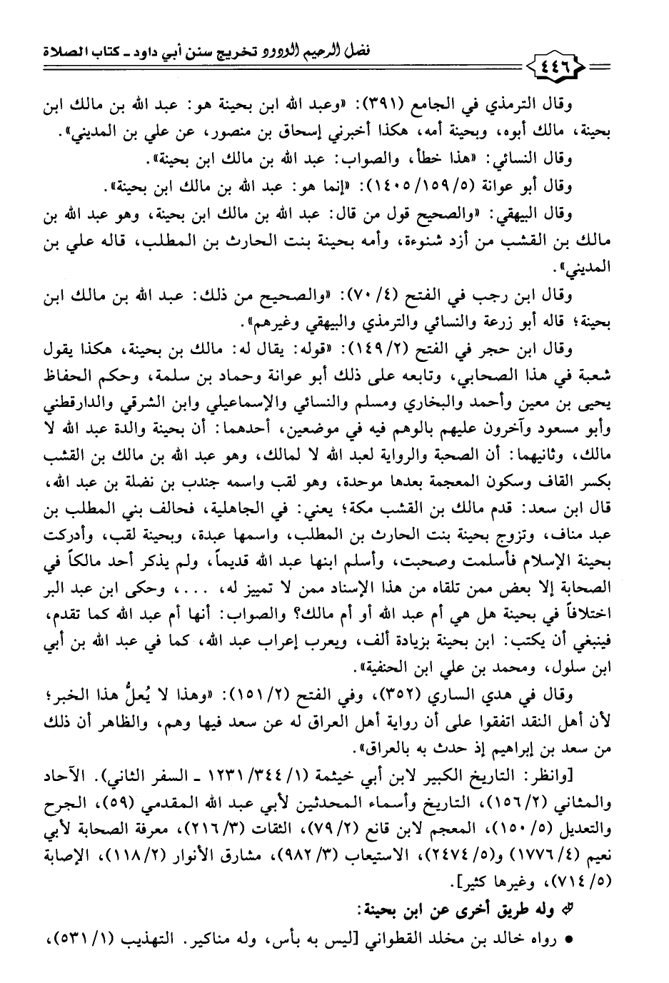 وقال ابن حجر في الفتح (٢/ ١٤٩): "قوله: يقال له: مالك بن بحينة، هكذا يقول شعبة في هذا الصحابي، وتابعه على ذلك أبو عوانة وحماد بن سلمة، وحكم الحفاظ يحيى بن معين وأحمد والبخاري ومسلم والنسائي والإسماعيلي وابن الشرقي والدارقطني وأبو مسعود وآخرون عليهم بالوهم فيه في موضعين، أحدهما: أن بحينة والدة عبد الله لا مالك، وثانيهما: أن الصحبة والرواية لعبد الله لا لمالك، وهو عبد الله بن مالك بن القشب بكسر القاف وسكون المعجمة بعدها موحدة، وهو لقب واسمه جندب بن نضلة بن عبد الله، قال ابن سعد: قدم مالك بن القشب مكة؛ يعني: في الجاهلية، فحالف بني المطلب بن عبد مناف، وتزوج بحينة بنت الحارث بن المطلب، واسمها عبدة، وبحينة لقب، وأدركت بحينة الإسلام فأسلمت وصحبت، وأسلم ابنها عبد الله قديمًا، ولم يذكر أحد مالكًا في الصحابة إلا بعض ممن تلقاه من هذا الإسناد ممن لا تمييز له، ... ، وحكى ابن عبد البر اختلافًا في بحينة هل هي أم عبد الله أو أم مالك؟ والصواب: أنها أم عبد الله كما تقدم، فينبغي أن يكتب: ابن بحينة بزيادة ألف، ويعرب إعراب عبد الله، كما في عبد الله بن أبي بن سلول، ومحمد بن علي ابن الحنفية".