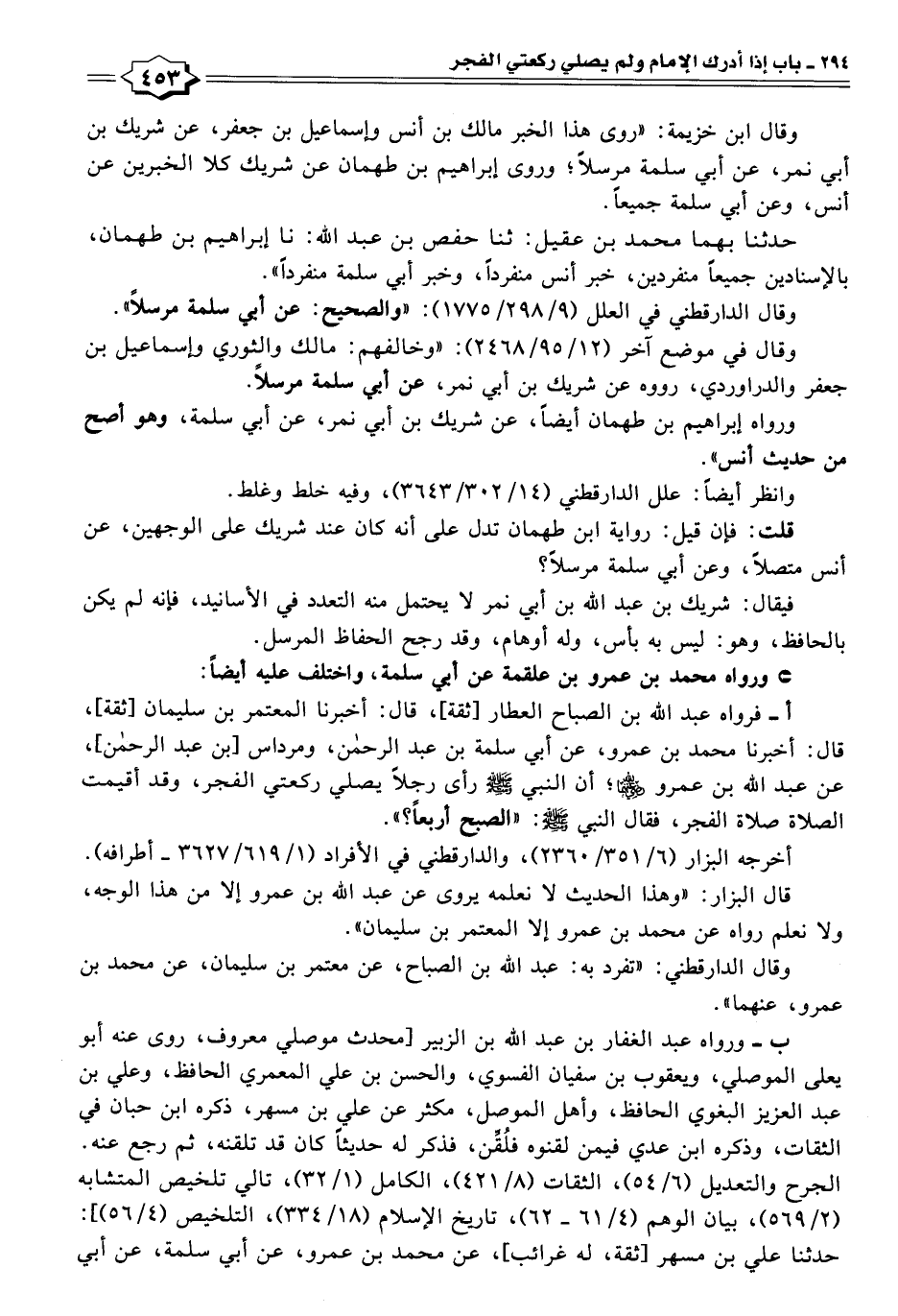 أ - فرواه عبد الله بن الصباح العطار [ثقة]، قال: أخبرنا المعتمر بن سليمان [ثقة]، قال: أخبرنا محمد بن عمرو، عن أبي سلمة بن عبد الرحمن، ومرداس [بن عبد الرحمن]، عن عبد الله بن عمرو - رضي الله عنهما -؛ أن النبي - صلى الله عليه وسلم - رأى رجلًا يصلي ركعتي الفجر، وقد أقيمت الصلاة صلاة الفجر، فقال النبي - صلى الله عليه وسلم -: "الصبح أربعًا؟ ".