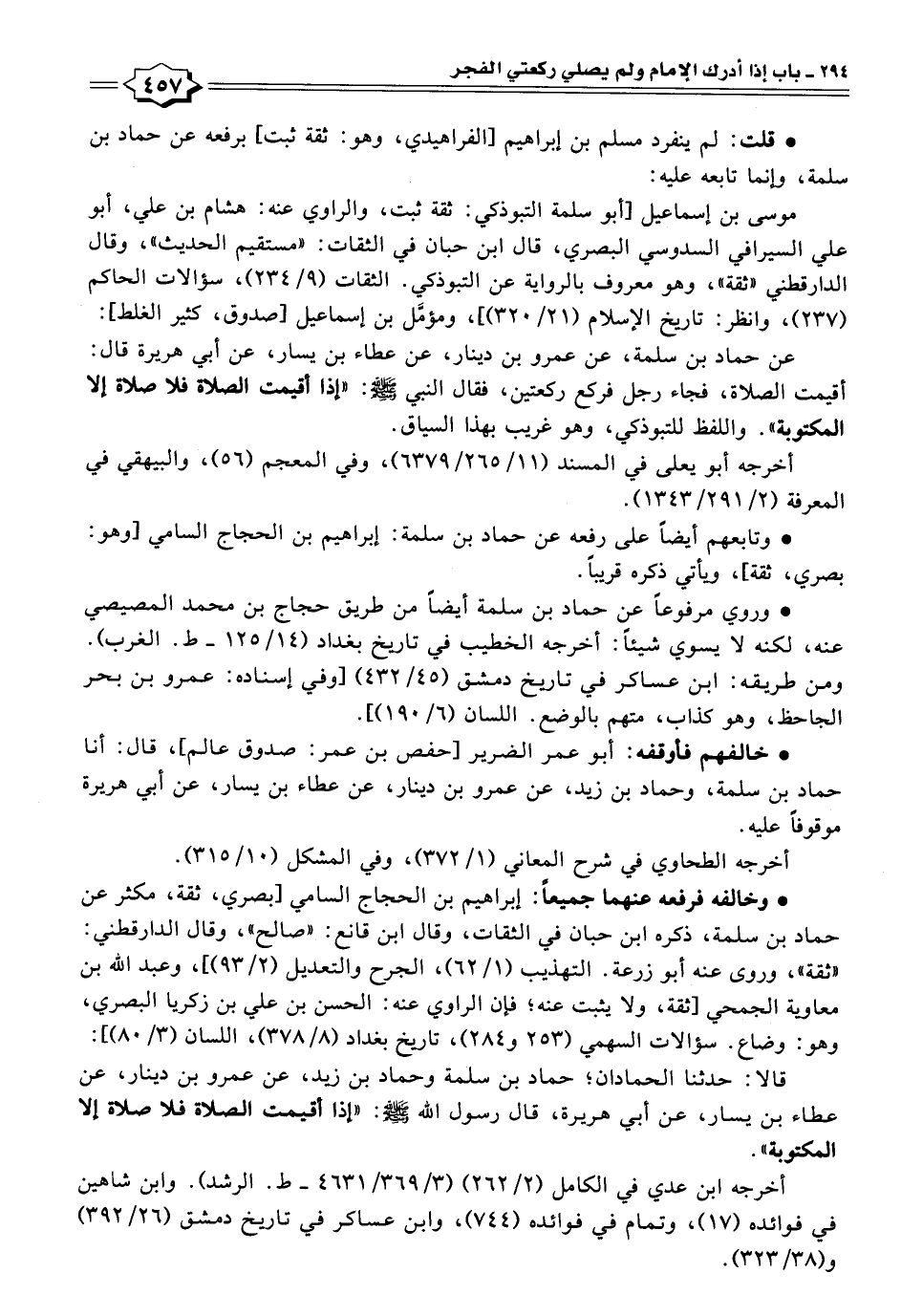عن حماد بن سلمة، عن عمرو بن دينار، عن عطاء بن يسار، عن أبي هريرة قال: أقيمت الصلاة، فجاء رجل فركع ركعتين، فقال النبي - صلى الله عليه وسلم -: "إذا أقيمت الصلاة فلا صلاة إلا المكتوبة". واللفظ للتبوذكي، وهو غريب بهذا السياق.