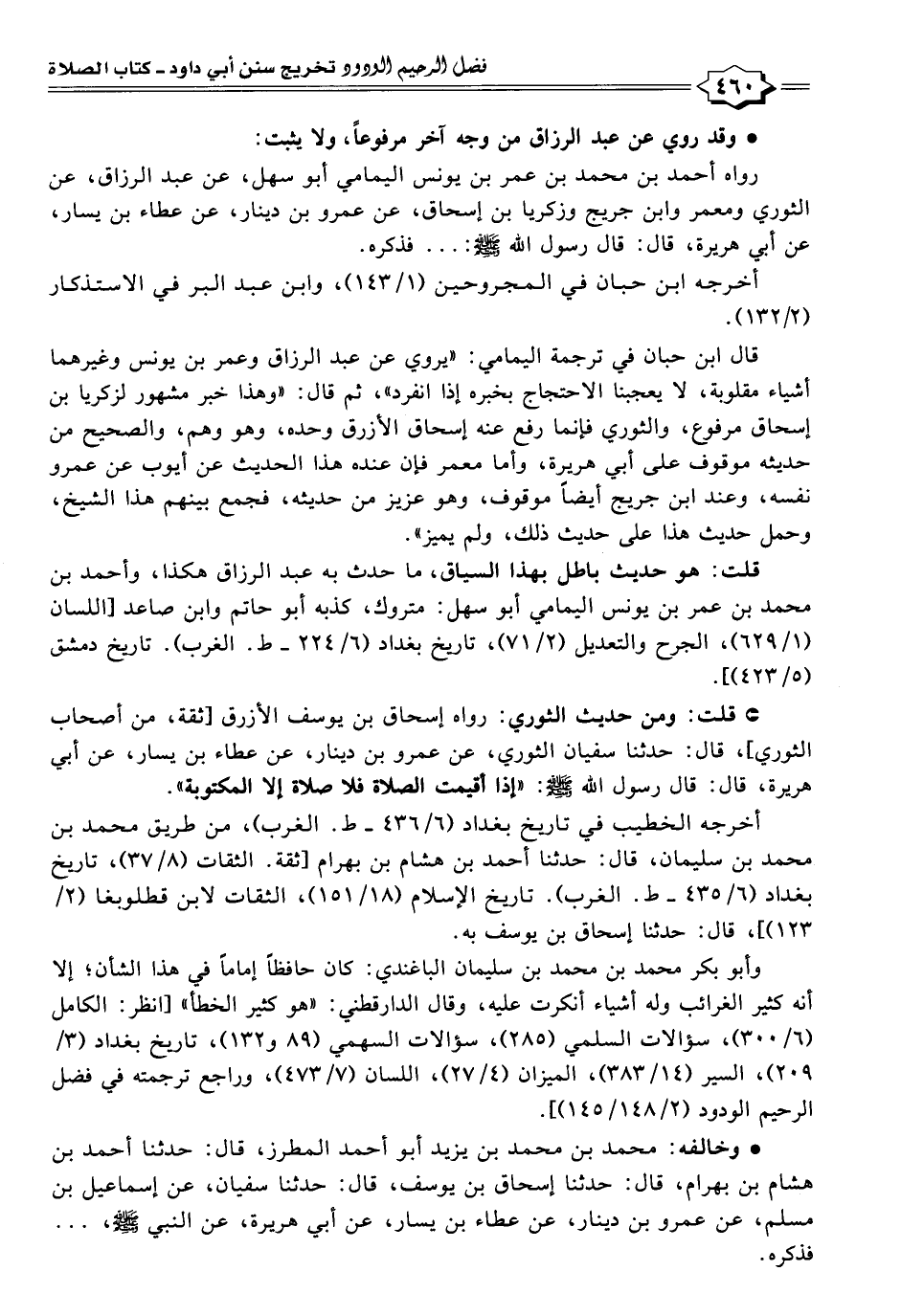 رواه أحمد بن محمد بن عمر بن يونس اليمامي أبو سهل، عن عبد الرزاق، عن الثوري ومعمر وابن جريج وزكريا بن إسحاق، عن عمرو بن دينار، عن عطاء بن يسار، عن أبي هريرة، قال: قال رسول الله - صلى الله عليه وسلم -: ... فذكره.
