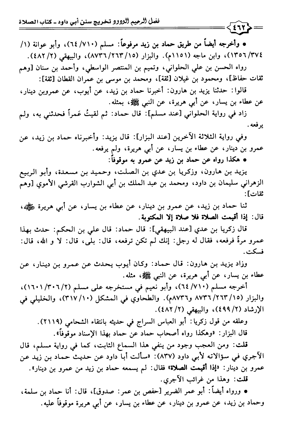 قلت: ومن العجب وجود من ينفي هذا السماع الثابت، كما في رواية مسلم، قال الآجري في سؤالاته لأبي داود (٨٣٧): "سألت أبا داود عن حديث حماد بن زيد عن عمرو بن دينار: "إذا أقيمت الصلاة" فقال: لم يسمعه حماد بن زيد من عمرو بن دينار".