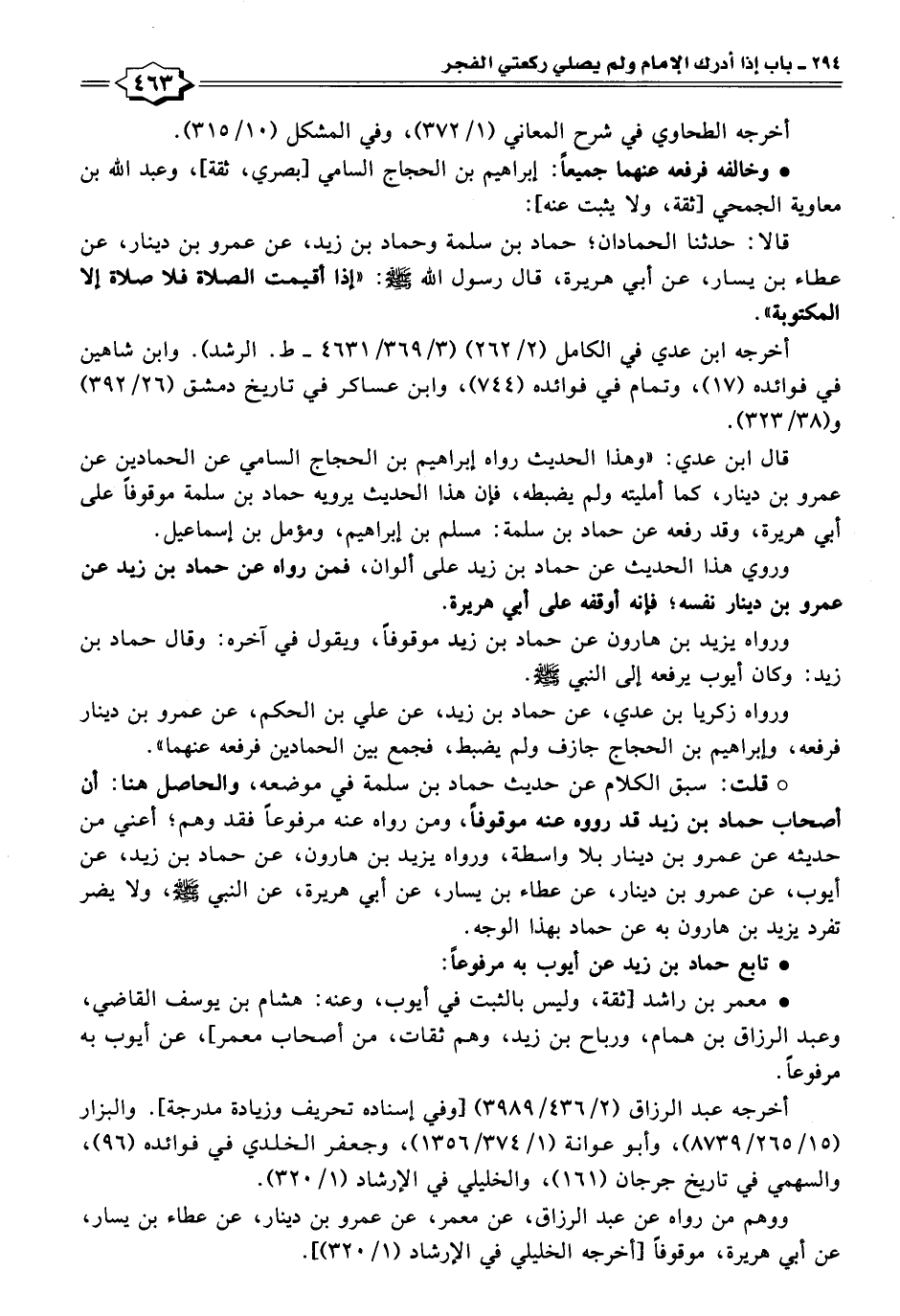 قالا: حدثنا الحمادان؛ حماد بن سلمة وحماد بن زيد، عن عمرو بن دينار، عن عطاء بن يسار، عن أبي هريرة، قال رسول الله - صلى الله عليه وسلم -: "إذا أقيمت الصلاة فلا صلاة إلا المكتوبة".