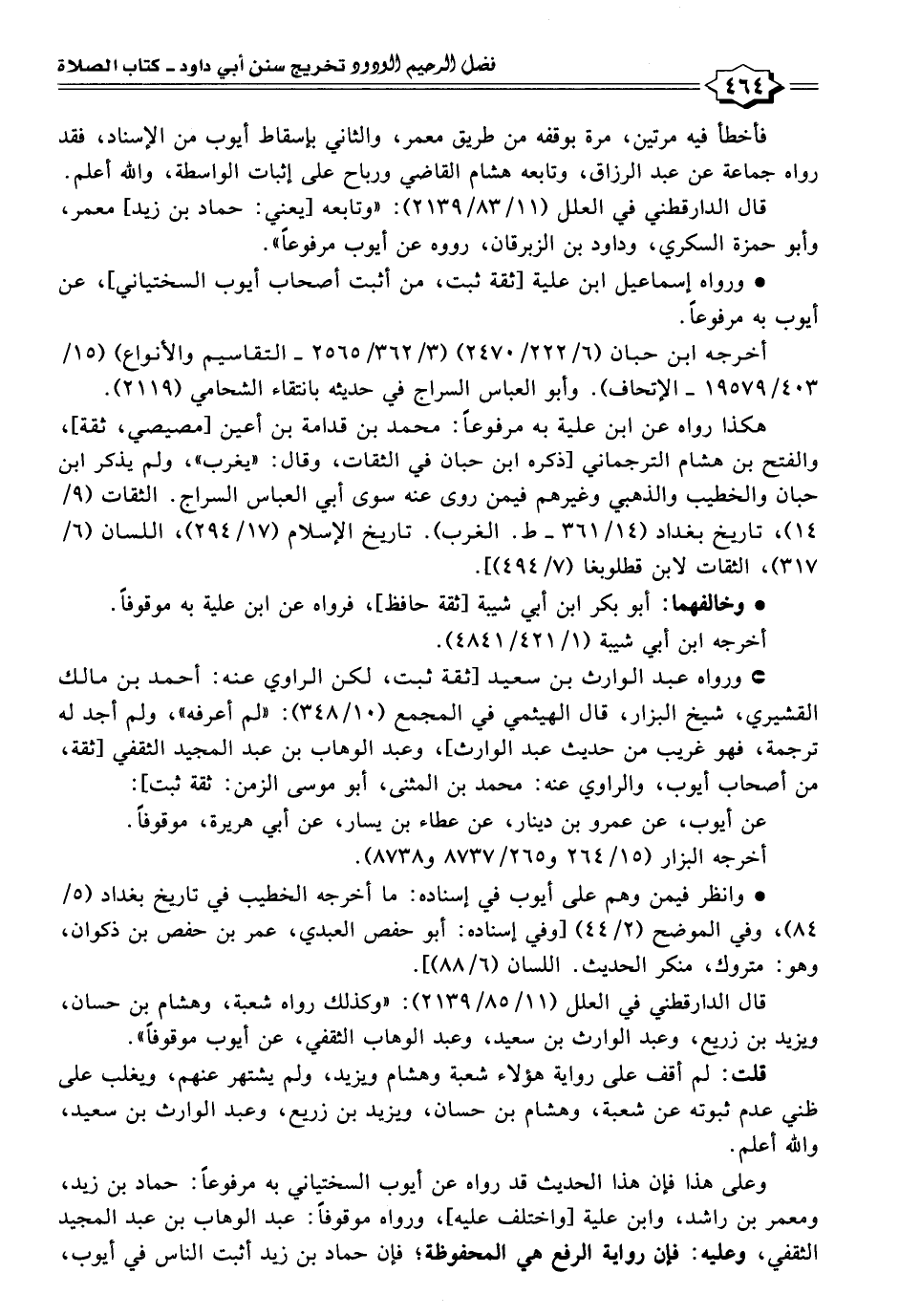 وعلى هذا فإن هذا الحديث قد رواه عن أيوب السختياني به مرفوعًا: حماد بن زيد، ومعمر بن راشد، وابن علية [واختلف عليه]، ورواه موقوفًا: عبد الوهاب بن عبد المجيد الثقفي، وعليه: فإن رواية الرفع هي المحفوظة؛ فإن حماد بن زيد أثبت الناس في أيوب،
