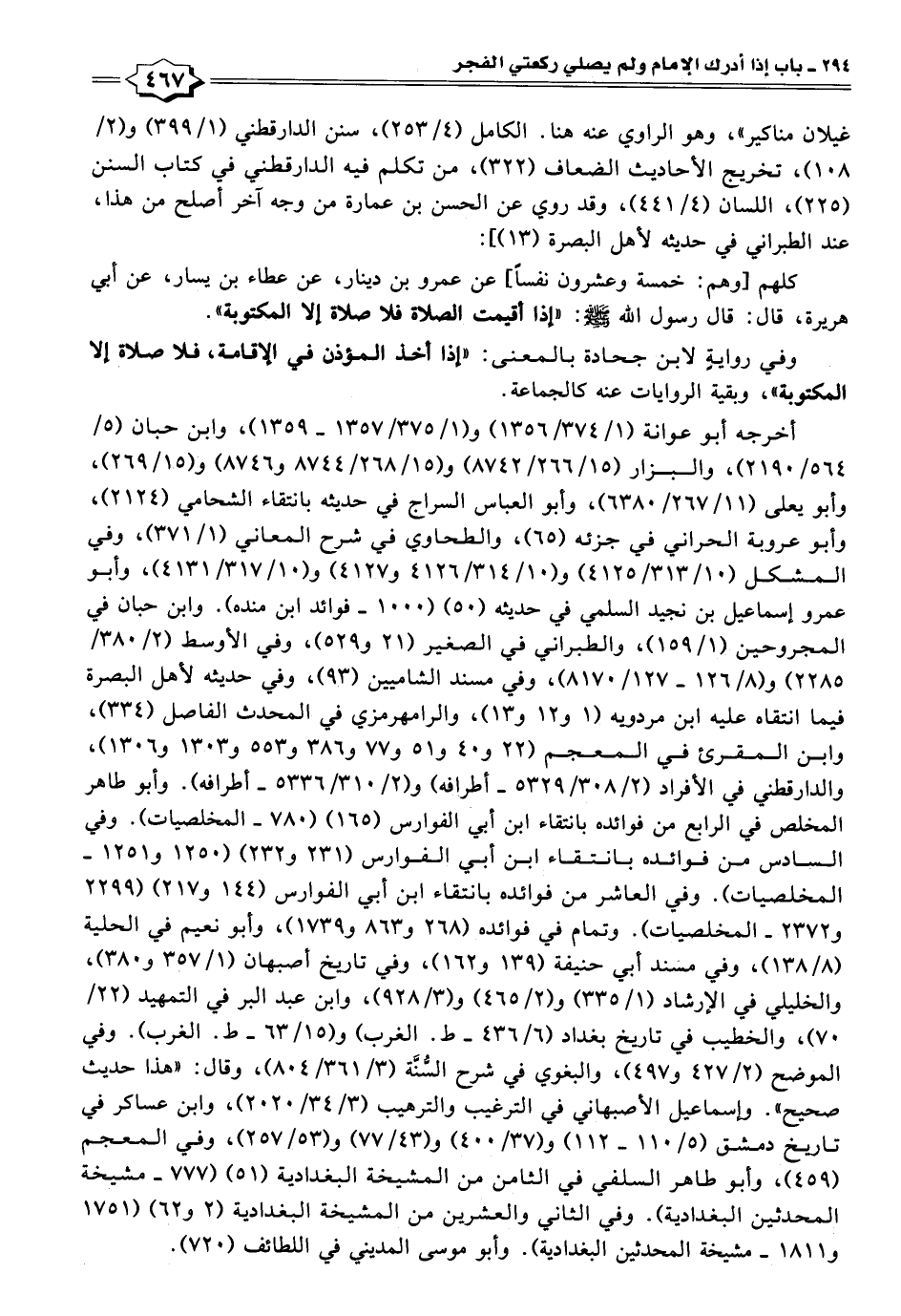 كلهم [وهم: خمسة وعشرون نفسًا]، عن عمرو بن دينار، عن عطاء بن يسار، عن أبي هريرة، قال: قال رسول الله - صلى الله عليه وسلم -: "إذا أقيمت الصلاة فلا صلاة إلا المكتوبة".
