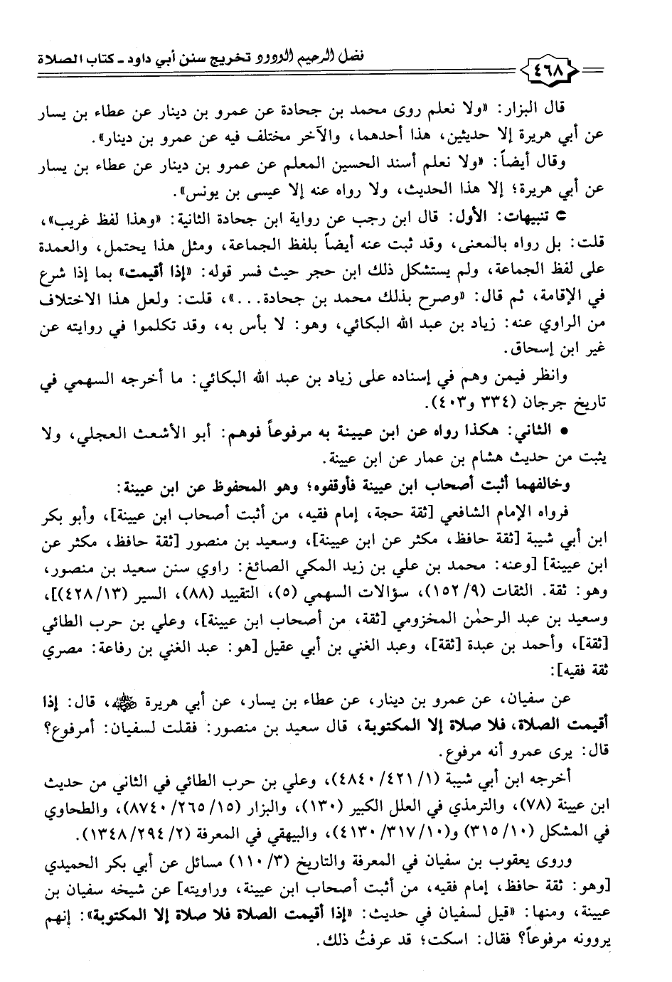 • تنبيهات: الأول: قال ابن رجب عن رواية ابن جحادة الثانية: "وهذا لفظ غريب"، قلت: بل رواه بالمعنى، وقد ثبت عنه أيضًا بلفظ الجماعة، ومثل هذا يحتمل، والعمدة على لفظ الجماعة، ولم يستشكل ذلك ابن حجر حيث فسر قوله: "إذا أقيمت" بما إذا شرع في الإقامة، ثم قال: "وصرح بذلك محمد بن جحادة ... "، قلت: ولعل هذا الاختلاف من الراوي عنه: زياد بن عبد الله البكائي، وهو: لا بأس به، وقد تكلموا في روايته عن غير ابن إسحاق.