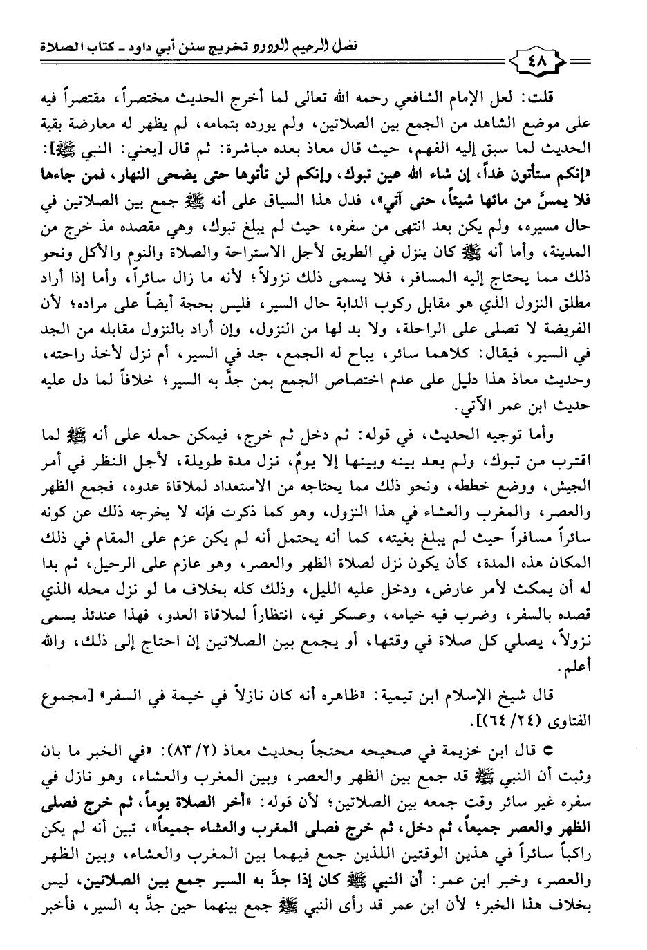 * قال ابن خزيمة في صحيحه محتجًا بحديث معاذ (٢/ ٨٣): "في الخبر ما بان وثبت أن النبي -صلى اللَّه عليه وسلم- قد جمع بين الظهر والعصر، وبين المغرب والعشاء، وهو نازل في سفره غير سائر وقت جمعه بين الصلاتين؛ لأن قوله: "أخر الصلاة يومًا، ثم خرج فصلى الظهر والعصر جميعًا، ثم دخل، ثم خرج فصلى المغرب والعشاء جميعًا"، تبين أنه لم يكن راكبًا سائرًا في هذين الوقتين اللذين جمع فيهما بين المغرب والعشاء، وبين الظهر والعصر، وخبر ابن عمر: أن النبي -صلى اللَّه عليه وسلم- كان إذا جدَّ به السير جمع بين الصلاتين، ليس بخلاف هذا الخبر؛ لأن ابن عمر قد رأى النبي -صلى اللَّه عليه وسلم- جمع بينهما حين جدَّ به السير، فأخبر