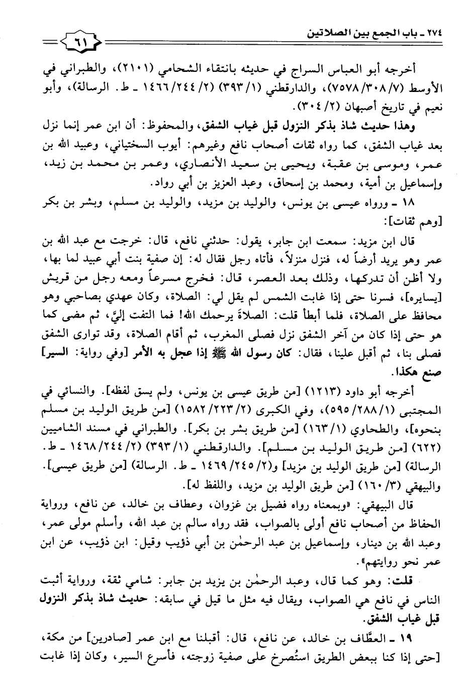 قال ابن مزيد: سمعت ابن جابر، يقول: حدثني نافع، قال: خرجت مع عبد الله بن عمر وهو يريد أرضًا له، فنزل منزلًا، فأتاه رجل فقال له: إن صفية بنت أبي عبيد لما بها، ولا أظن أن تدركها، وذلك بعد العصر، قال: فخرج مسرعًا ومعه رجل من قريش [يسايره]، فسرنا حتى إذا غابت الشمس لم يقل لي: الصلاة، وكان عهدي بصاحبي وهو محافظ على الصلاة، فلما أبطأ قلت: الصلاةَ يرحمك الله! فما التفت إليَّ، ثم مضى كما هو حتى إذا كان من آخر الشفق نزل فصلى المغرب، ثم أقام الصلاة، وقد توارى الشفق فصلى بنا، ثم أقبل علينا، فقال: كان رسول الله -صَلَّى اللهُ عَلَيْهِ وَسَلَّمَ- إذا عجل به الأمر [وفي رواية: السير] صنع هكذا.