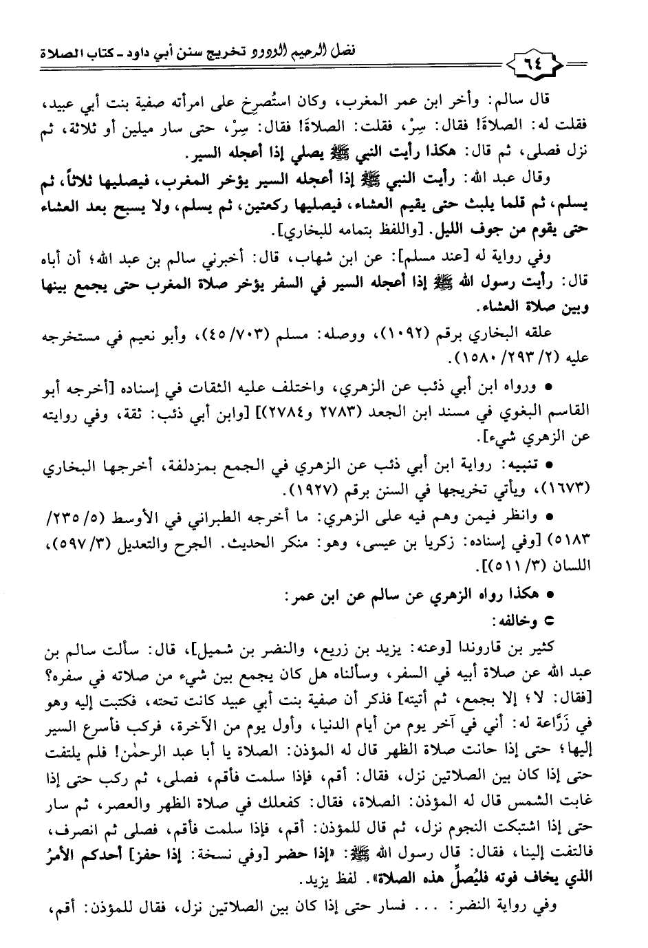 قال سالم: وأخر ابن عمر المغرب، وكان استُصرِخ على امرأته صفية بنت أبي عبيد، فقلت له: الصلاةَ! فقال: سِرْ، فقلت: الصلاةَ! فقال: سِرْ، حتى سار ميلين أو ثلاثة، ثم نزل فصلى، ثم قال: هكذا رأيت النبي -صَلَّى اللهُ عَلَيْهِ وَسَلَّمَ- يصلي إذا أعجله السير.