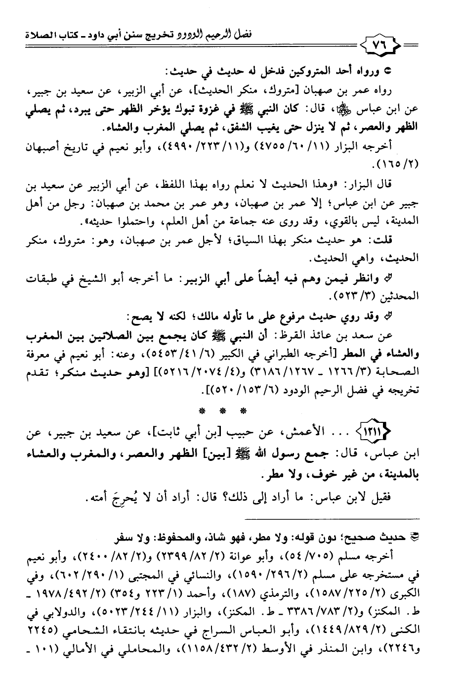 رواه عمر بن صهبان [متروك، منكر الحديث]، عن أبي الزبير، عن سعيد بن جبير، عن ابن عباس -رَضِيَ اللهُ عَنْهُمَا-، قال: كان النبي -صَلَّى اللهُ عَلَيْهِ وَسَلَّمَ- في غزوة تبوك يؤخر الظهر حتى يبرد، ثم يصلي الظهر والعصر، ثم لا ينزل حتى يغيب الشفق، ثم يصلي المغرب والعشاء.