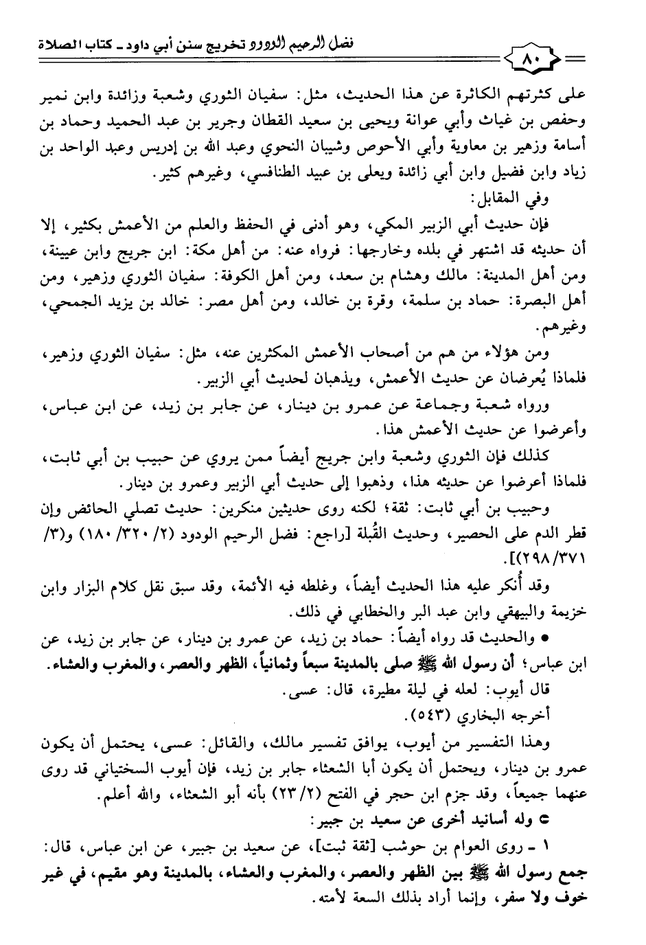 ١ - روى العوام بن حوشب [ثقة ثبت]، عن سعيد بن جبير، عن ابن عباس، قال: جمع رسول الله -صَلَّى اللهُ عَلَيْهِ وَسَلَّمَ- بين الظهر والعصر، والمغرب والعشاء، بالمدينة وهو مقيم، في غير خوف ولا سفر، وإنما أراد بذلك السعة لأمته.