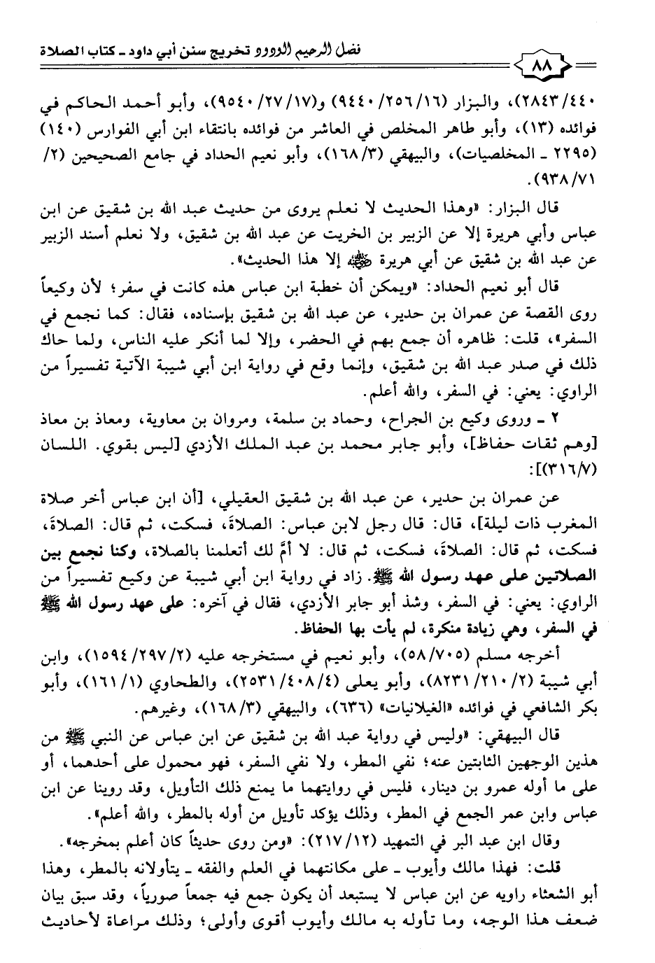 عن عمران بن حدير، عن عبد الله بن شقيق العقيلي، [أن ابن عباس أخر صلاة المغرب ذات ليلة]، قال: قال رجل لابن عباس: الصلاةَ، فسكت، ثم قال: الصلاةَ، فسكت، ثم قال: الصلاةَ، فسكت، ثم قال: لا أمَّ لك أتعلمنا بالصلاة، وكنا نجمع بين الصلاتين على عهد رسول الله -صَلَّى اللهُ عَلَيْهِ وَسَلَّمَ-. زاد في رواية ابن أبي شيبة عن وكيع تفسيرًا من الراوي: يعني: في السفر، وشذ أبو جابر الأزدي، فقال في آخره: على عهد رسول الله -صَلَّى اللهُ عَلَيْهِ وَسَلَّمَ- في السفر، وهي زيادة منكرة، لم يأت بها الحفاظ.