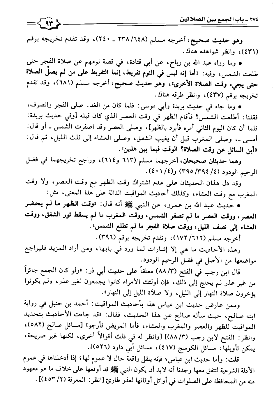 وممن عارض حديث ابن عباس هذا بأحاديث المواقيت: أحمد بن حنبل في رواية ابنه صالح، حيث سأله صالح عن هذا الحديث، فقال: "قد جاءت الأحاديث بتحديد المواقيت للظهر والعصر والمغرب والعشاء، فأما المريض فأرجو" [مسائل صالح (٥٨٢)، وانظر: الفتح لابن رجب (٣/ ٨٨)] [وانظر له في ذلك أقوالًا أخرى، لكنها غير صريحة، يمكن تأويلها: مسائل الكوسج (٤١٧)، مسائل أبي داود (٥٢٦)].