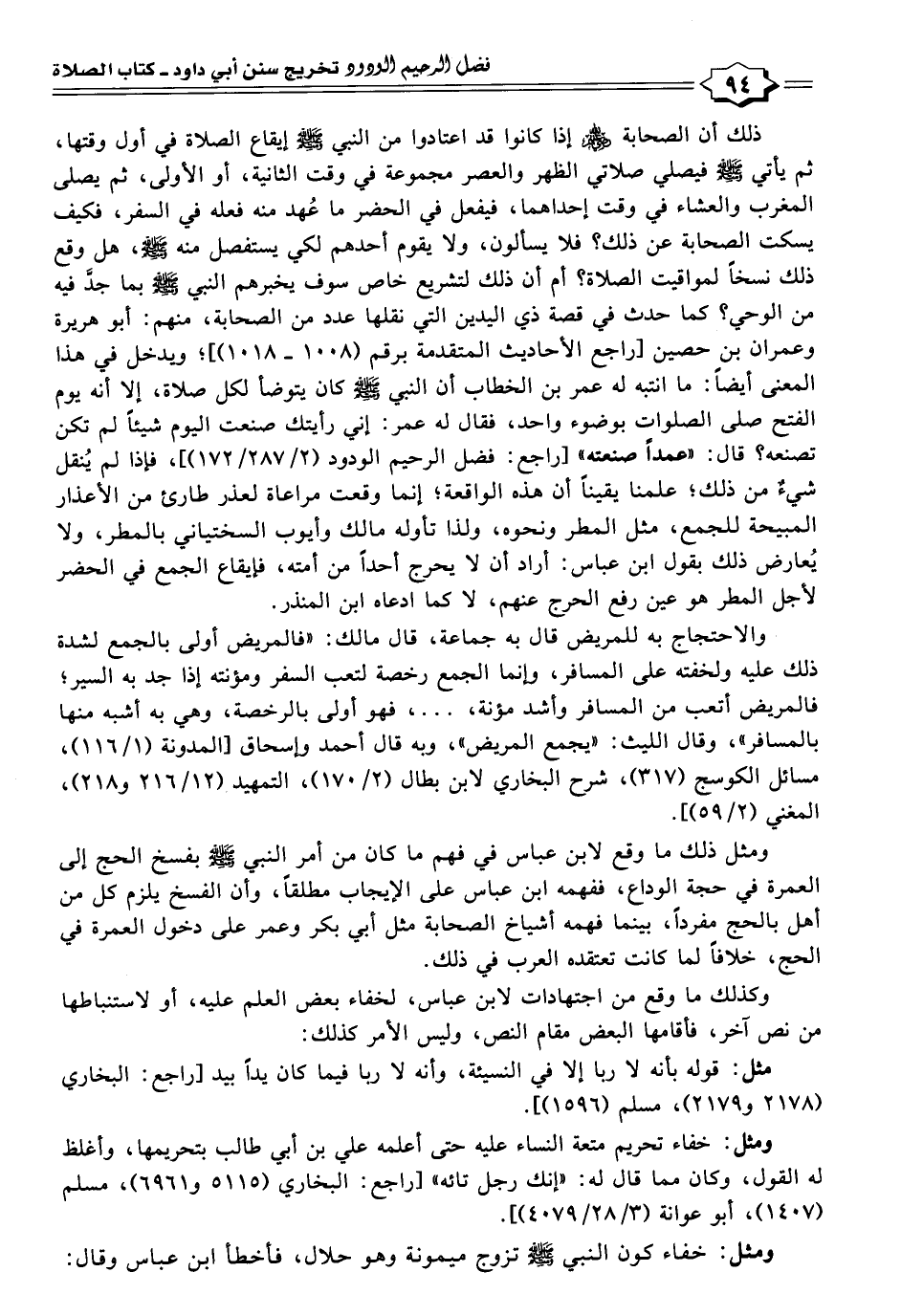 ذلك أن الصحابة -رَضِيَ اللهُ عَنْهُم- إذا كانوا قد اعتادوا من النبي -صَلَّى اللهُ عَلَيْهِ وَسَلَّمَ- إيقاع الصلاة في أول وقتها، ثم يأتي -صَلَّى اللهُ عَلَيْهِ وَسَلَّمَ- فيصلي صلاتي الظهر والعصر مجموعة في وقت الثانية، أو الأولى، ثم يصلى المغرب والعشاء في وقت إحداهما، فيفعل في الحضر ما عُهد منه فعله في السفر، فكيف يسكت الصحابة عن ذلك؟ فلا يسألون، ولا يقوم أحدهم لكي يستفصل منه -صَلَّى اللهُ عَلَيْهِ وَسَلَّمَ-، هل وقع ذلك نسخًا لمواقيت الصلاة؟ أم أن ذلك لتشريع خاص سوف يخبرهم النبي -صَلَّى اللهُ عَلَيْهِ وَسَلَّمَ- بما جدَّ فيه من الوحي؟ كما حدث في قصة ذي اليدين التي نقلها عدد من الصحابة، منهم: أبو هريرة وعمران بن حصين [راجع الأحاديث المتقدمة برقم (١٠٠٨ - ١٠١٨)]؛ ويدخل في هذا المعنى أيضًا: ما انتبه له عمر بن الخطاب أن النبي -صَلَّى اللهُ عَلَيْهِ وَسَلَّمَ- كان يتوضأ لكل صلاة، إلا أنه يوم الفتح صلى الصلوات بوضوء واحد، فقال له عمر: إني رأيتك صنعت اليوم شيئًا لم تكن تصنعه؟ قال: "عمدًا صنعته" [راجع: فضل الرحيم الودود (٢/ ٢٨٧/ ١٧٢)]، فإذا لم يُنقل شيءٌ من ذلك؛ علمنا يقينًا أن هذه الواقعة؛ إنما وقعت مراعاة لعذر طارئ من الأعذار المبيحة للجمع، مثل المطر ونحوه، ولذا تأوله مالك وأيوب السختياني بالمطر، ولا يُعارض ذلك بقول ابن عباس: أراد أن لا يحرج أحدًا من أمته، فإيقاع الجمع في الحضر لأجل المطر هو عين رفع الحرج عنهم، لا كما ادعاه ابن المنذر.