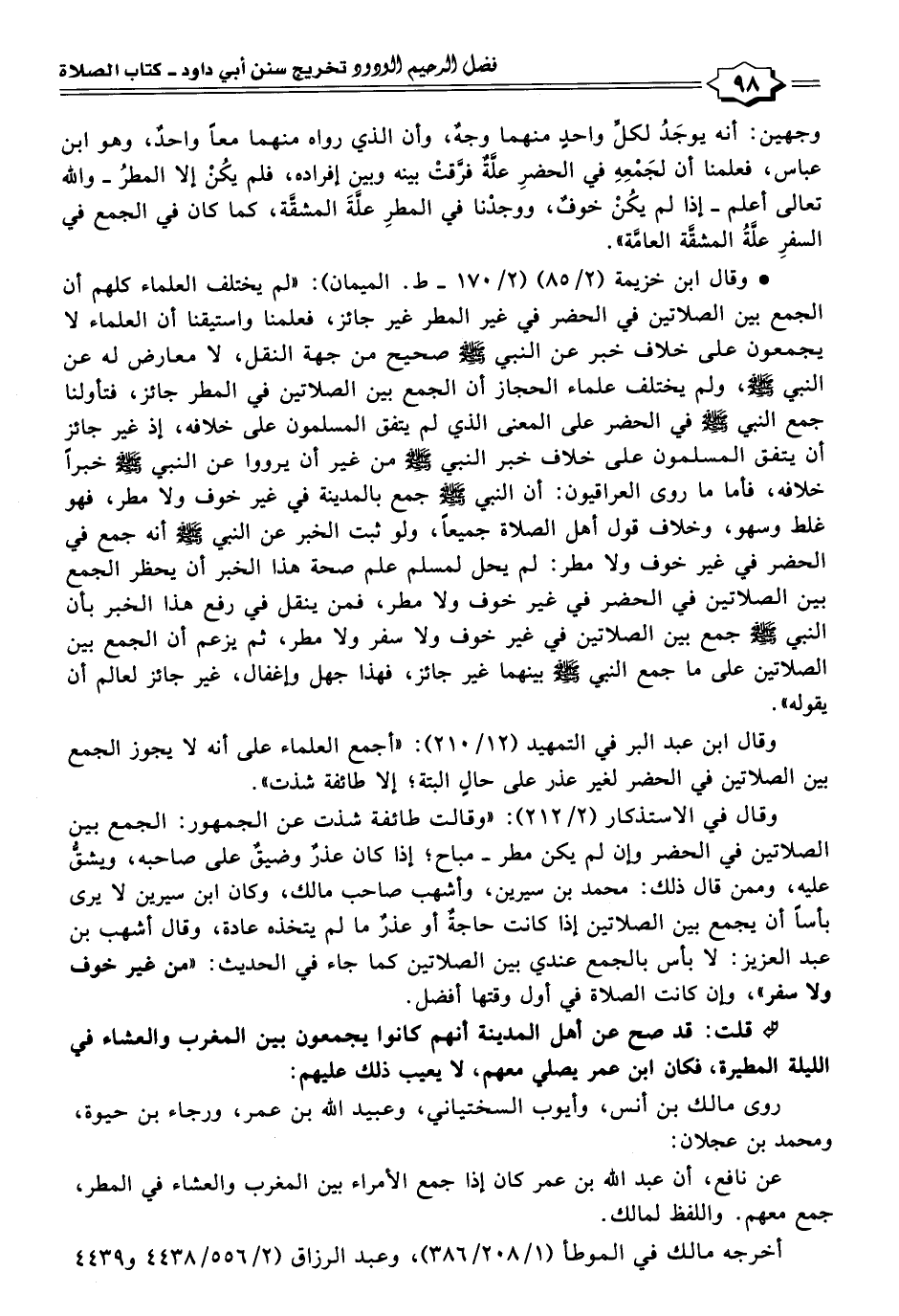 * وقال ابن خزيمة (٢/ ٨٥) (٢/ ١٧٠ - ط. الميمان): "لم يختلف العلماء كلهم أن الجمع بين الصلاتين في الحضر في غير المطر غير جائز، فعلمنا واستيقنا أن العلماء لا يجمعون على خلاف خبر عن النبي -صَلَّى اللهُ عَلَيْهِ وَسَلَّمَ- صحيح من جهة النقل، لا معارض له عن النبي -صَلَّى اللهُ عَلَيْهِ وَسَلَّمَ-، ولم يختلف علماء الحجاز أن الجمع بين الصلاتين في المطر جائز، فتأولنا جمع النبي -صَلَّى اللهُ عَلَيْهِ وَسَلَّمَ- في الحضر على المعنى الذي لم يتفق المسلمون على خلافه، إذ غير جائز أن يتفق المسلمون على خلاف خبر النبي -صَلَّى اللهُ عَلَيْهِ وَسَلَّمَ- من غير أن يرووا عن النبي -صَلَّى اللهُ عَلَيْهِ وَسَلَّمَ- خبرًا خلافه، فأما ما روى العراقيون: أن النبي -صَلَّى اللهُ عَلَيْهِ وَسَلَّمَ- جمع بالمدينة في غير خوف ولا مطر، فهو غلط وسهو، وخلاف قول أهل الصلاة جميعًا، ولو ثبت الخبر عن النبي -صَلَّى اللهُ عَلَيْهِ وَسَلَّمَ- أنه جمع في الحضر في غير خوف ولا مطر: لم يحل لمسلم علم صحة هذا الخبر أن يحظر الجمع بين الصلاتين في الحضر في غير خوف ولا مطر، فمن ينقل في رفع هذا الخبر بأن النبي -صَلَّى اللهُ عَلَيْهِ وَسَلَّمَ- جمع بين الصلاتين في غير خوف ولا سفر ولا مطر، ثم يزعم أن الجمع بين الصلاتين على ما جمع النبي -صَلَّى اللهُ عَلَيْهِ وَسَلَّمَ- بينهما غير جائز، فهذا جهل وإغفال، غير جائز لعالم أن يقوله".