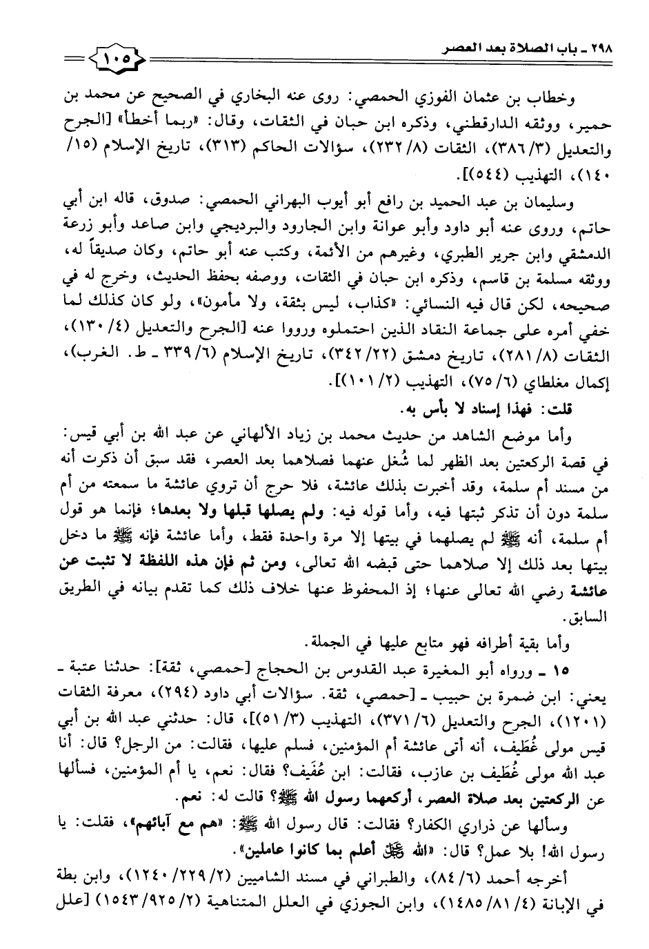 وأما موضع الشاهد من حديث محمد بن زياد الألهاني عن عبد الله بن أبي قيس: في قصة الركعتين بعد الظهر لما شُغل عنهما فصلاهما بعد العصر، فقد سبق أن ذكرت أنه من مسند أم سلمة، وقد أخبرت بذلك عائشة، فلا حرج أن تروي عائشة ما سمعته من أم سلمة دون أن تذكر ثبتها فيه، وأما قوله فيه: ولم يصلها قبلها ولا بعدها؛ فإنما هو قول أم سلمة، أنه -صلى الله عليه وسلم- لم يصلهما في بيتها إلا مرة واحدة فقط، وأما عائشة فإنه -صلى الله عليه وسلم- ما دخل بيتها بعد ذلك إلا صلاهما حتى قبضه الله تعالى، ومن ثم فإن هذه اللفظة لا تثبت عن عائشة رضي الله تعالى عنها؛ إذ المحفوظ عنها خلاف ذلك كما تقدم بيانه في الطريق السابق.