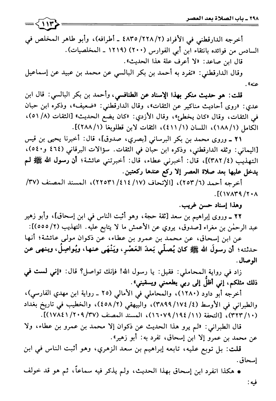 عن ابن إسحاق، عن محمد بن عمرو بن عطاء، عن ذكوان مولى عائشة؛ أنها حدثته؛ أن رسولَ الله -صلى الله عليه وسلم- كان يُصلِّي بَعدَ العَصْرِ، وَيَنْهَى عنها، ويُواصِلُ، وينهى عن الوصال.