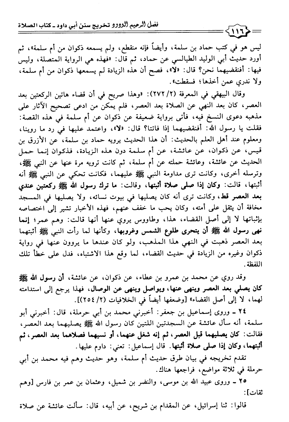 وقال البيهقي في المعرفة (٢/ ٢٧٢): "وهذا صريح في أن قضاء هاتين الركعتين بعد العصر، كان بعد النهي عن الصلاة بعد العصر، فلم يمكن من ادعى تصحيح الآثار على مذهبه دعوى النسخ فيه، فأتى برواية ضعيفة عن ذكوان عن أم سلمة في هذه القصة: فقلت يا رسول الله: أفنقضيهما إذا فاتتا؟ قال: "لا"، واعتمد عليها في رد ما روينا، ومعلوم عند أهل العلم بالحديث: أن هذا الحديث يرويه حماد بن سلمة، عن الأزرق بن قيس، عن ذكوان، عن عائشة، عن أم سلمة دون هذه الزيادة، فذكوان إنما حمل الحديث عن عائشة، وعائشة حملته عن أم سلمة، ثم كانت ترويه مرة عنها عن النبي -صلى الله عليه وسلم-، وترسله أخرى، وكانت ترى مداومة النبي -صلى الله عليه وسلم- عليهما، فكانت تحكي عن النبي -صلى الله عليه وسلم- أنه أثبتها، قالت: وكان إذا صلى صلاة أثبتها، وقالت: ما ترك رسول الله -صلى الله عليه وسلم- ركعتين عندي بعد العصر قط، وكانت ترى أنه كان يصليها في بيوت نسائه، ولا يصليها في المسجد مخافة أن يثقل على أمته، وكان يحب ما خفف عنهم، فهذه الأخبار تشير إلى اختصاصه بإثباتها لا إلى أصل القضاء، هذا، وطاووس يروي عنها أنها قالت: وهم عمر؛ إنما نهى رسول الله -صلى الله عليه وسلم- أن يتحرى طلوع الشمس وغروبها، وكأنها لما رأت النبي -صلى الله عليه وسلم- أثبتهما بعد العصر ذهبت في النهي هذا المذهب، ولو كان عندها ما يروون عنها في رواية ذكوان وغيره من الزيادة في حديث القضاء، لما وقع هذا الاشتباه، فدل على خطأ تلك اللفظة.