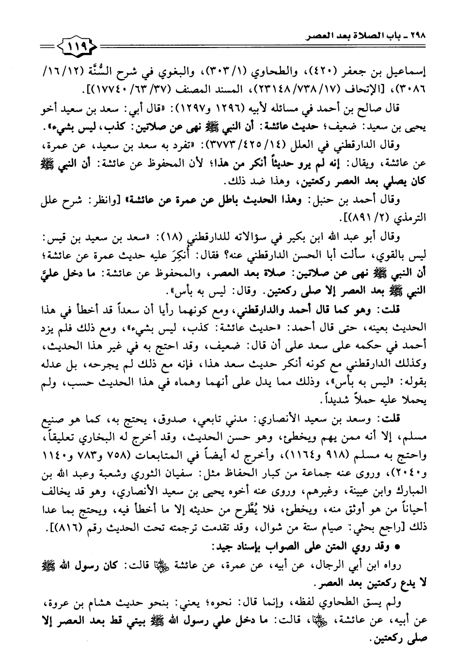 قلت: وهو كما قال أحمد والدارقطني، ومع كونهما رأيا أن سعدًا قد أخطأ في هذا الحديث بعينه، حتى قال أحمد: "حديث عائشة: كذب، ليس بشيء"، ومع ذلك فلم يزد أحمد في حكمه على سعد على أن قال: ضعيف، وقد احتج به في غير هذا الحديث، وكذلك الدارقطني مع كونه أنكر حديث سعد هذا، فإنه مع ذلك لم يجرحه، بل عدله بقوله: "ليس به بأس"، وذلك مما يدل على أنهما وهماه في هذا الحديث حسب، ولم يحملا عليه حملًا شديدًا.