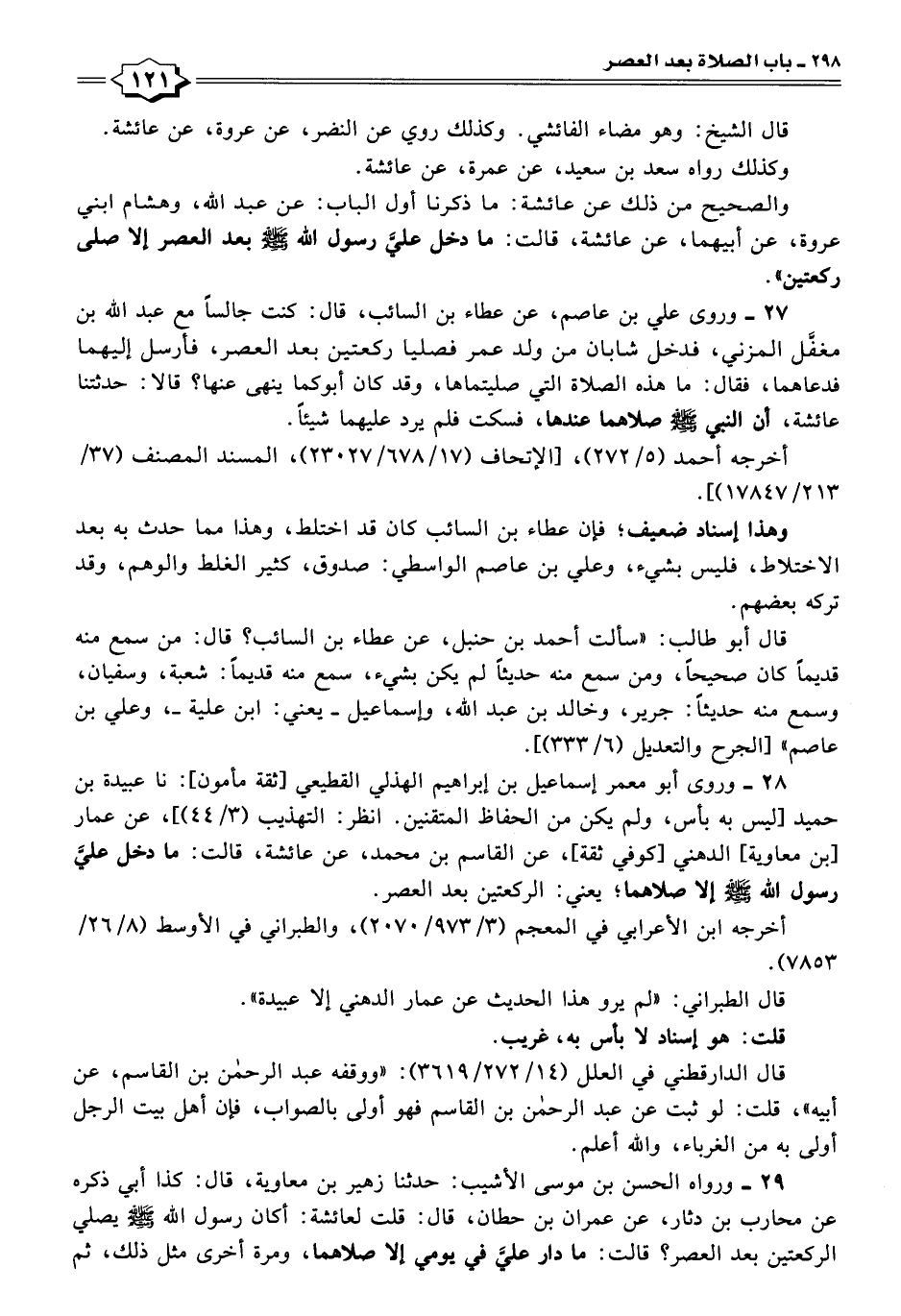 ٢٧ - وروى علي بن عاصم، عن عطاء بن السائب، قال: كنت جالسًا مع عبد الله بن مغفَّل المزني، فدخل شابان من ولد عمر فصليا ركعتين بعد العصر، فأرسل إليهما فدعاهما، فقال: ما هذه الصلاة التي صليتماها، وقد كان أبوكما ينهى عنها؟ قالا: حدثتنا عائشة، أن النبي -صلى الله عليه وسلم- صلاهما عندها، فسكت فلم يرد عليهما شيئًا.