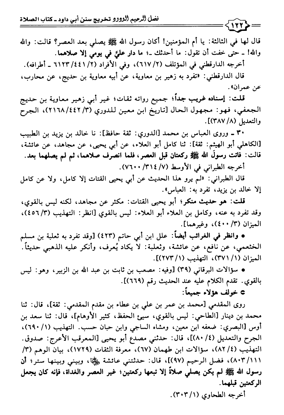 ٣٠ - وروى العباس بن محمد [الدوري: ثقة حافظ]: نا خالد بن يزيد بن الطبيب [الكاهلي أبو الهيثم: ثقة]: ثنا كامل أبو العلاء، عن أبي يحيى، عن مجاهد، عن عائشة، قالت: فاتت رسولَ الله -صلى الله عليه وسلم- ركعتان قبل العصر، فلما انصرف صلاهما، ثم لم يصلهما بعد.