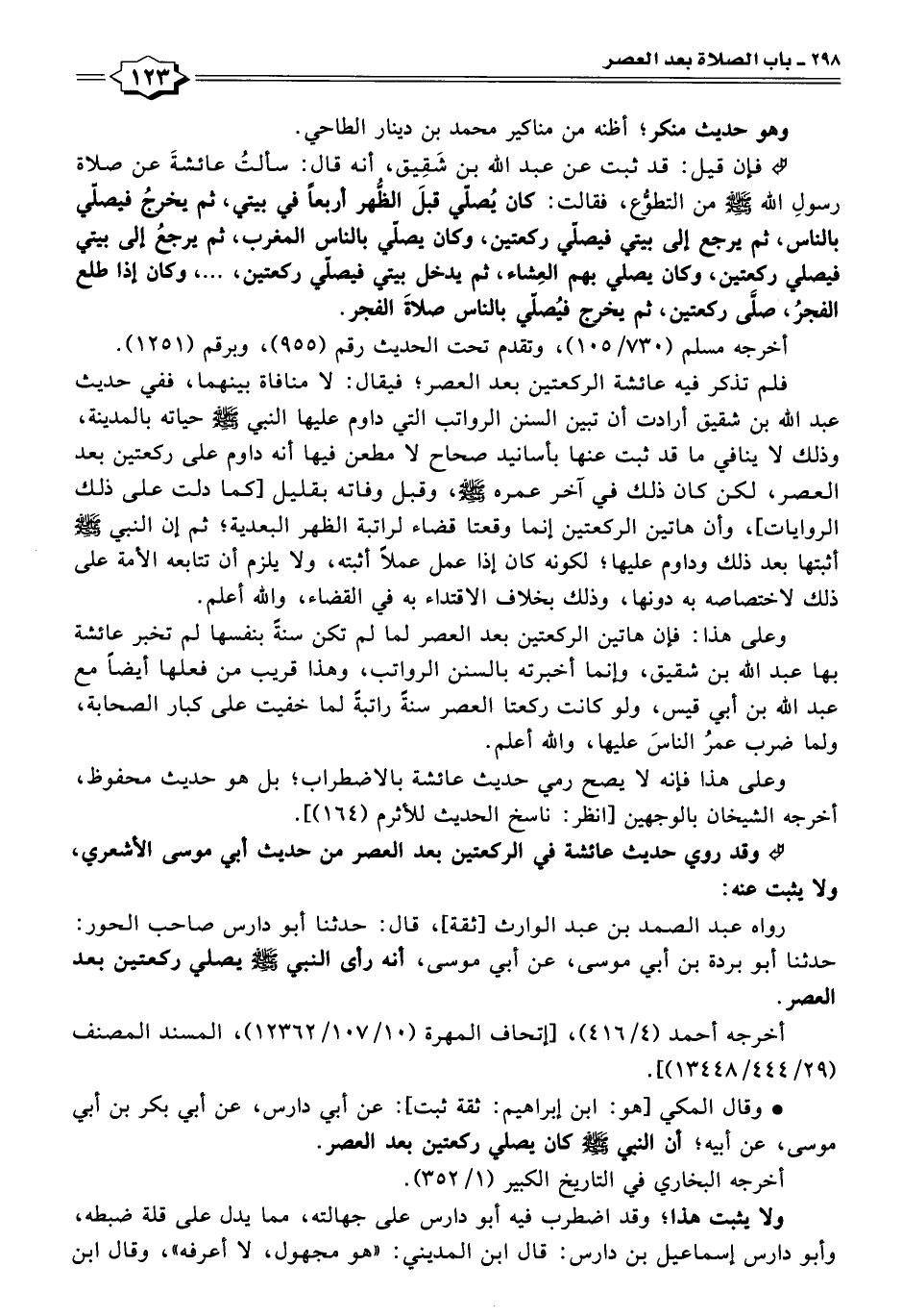 * وقال المكي [هو: ابن إبراهيم: ثقة ثبت]: عن أبي دارس، عن أبي بكر بن أبي موسى، عن أبيه؛ أن النبي -صلى الله عليه وسلم- كان يصلي ركعتين بعد العصر.