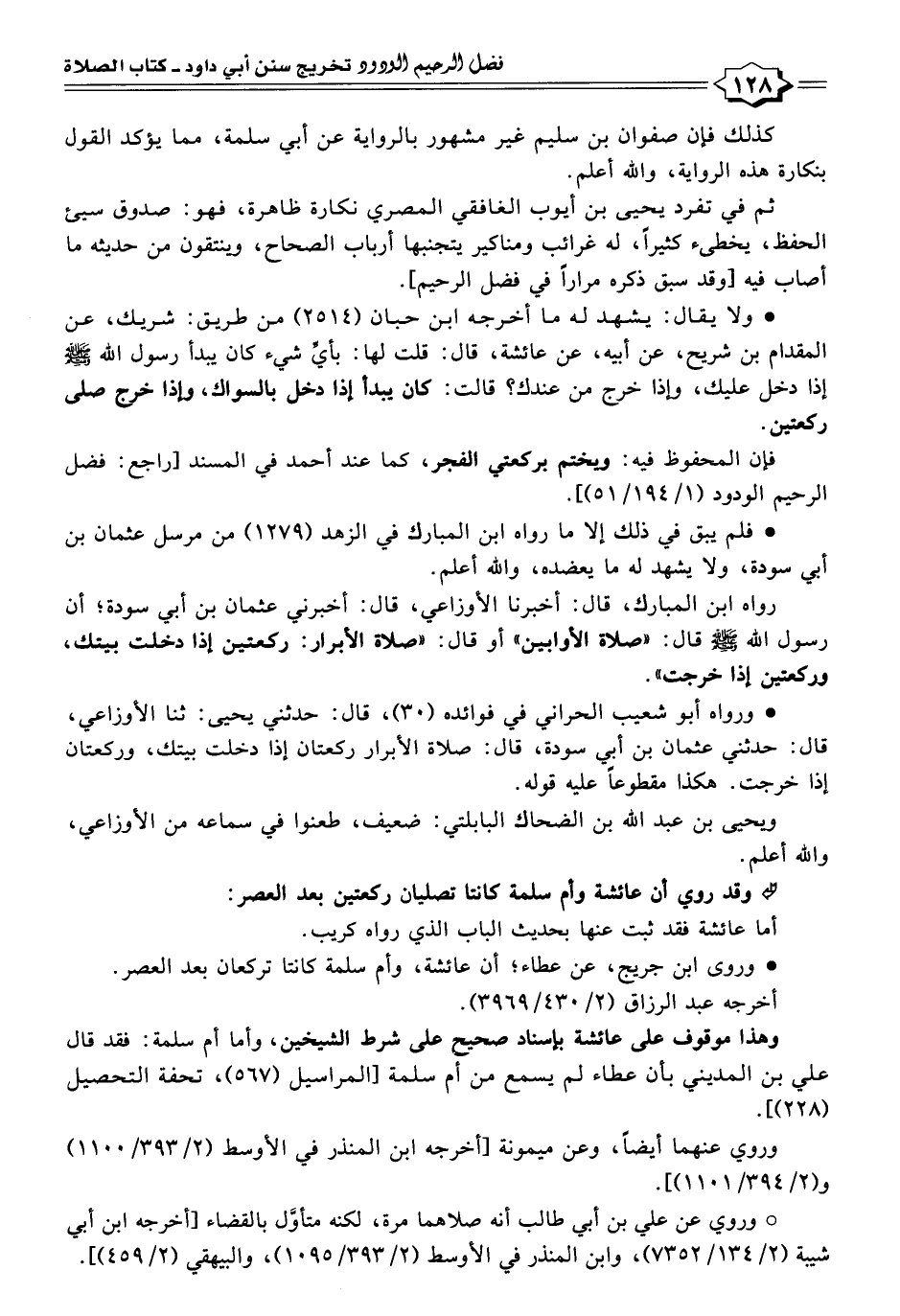 رواه ابن المبارك، قال: أخبرنا الأوزاعي، قال: أخبرني عثمان بن أبي سودة؛ أن رسول الله -صلى الله عليه وسلم- قال: "صلاة الأوابين" أو قال: "صلاة الأبرار: ركعتين إذا دخلت بيتك، وركعتين إذا خرجت".