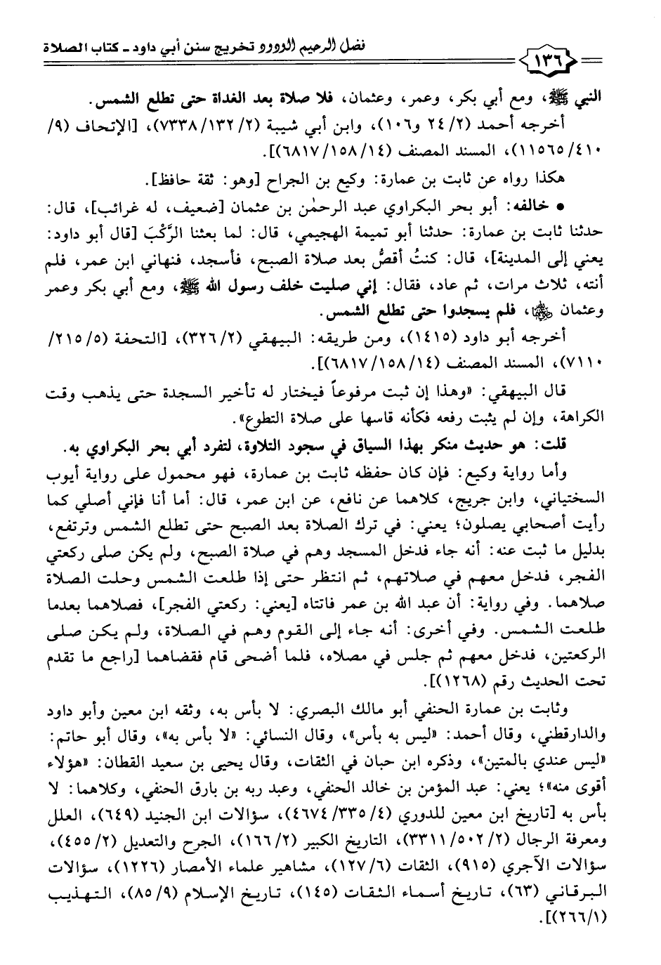 * خالفه: أبو بحر البكراوي عبد الرحمن بن عثمان [ضعيف له غرائب]، قال: حدثنا ثابت بن عمارة: حدثنا أبو تميمة الهجيمي، قال: لما بعثنا الرَّكْبَ [قال أبو داود: يعني إلى المدينة]، قال: كنتُ أقصُّ بعد صلاة الصبح، فأسجد، فنهاني ابن عمر، فلم أنته، ثلاث مرات، ثم عاد، فقال: إني صليت خلف رسول الله -صلى الله عليه وسلم-، ومع أبي بكر وعمر وعثمان -رضي الله عنهما-، فلم يسجدوا حتى تطلع الشمس.