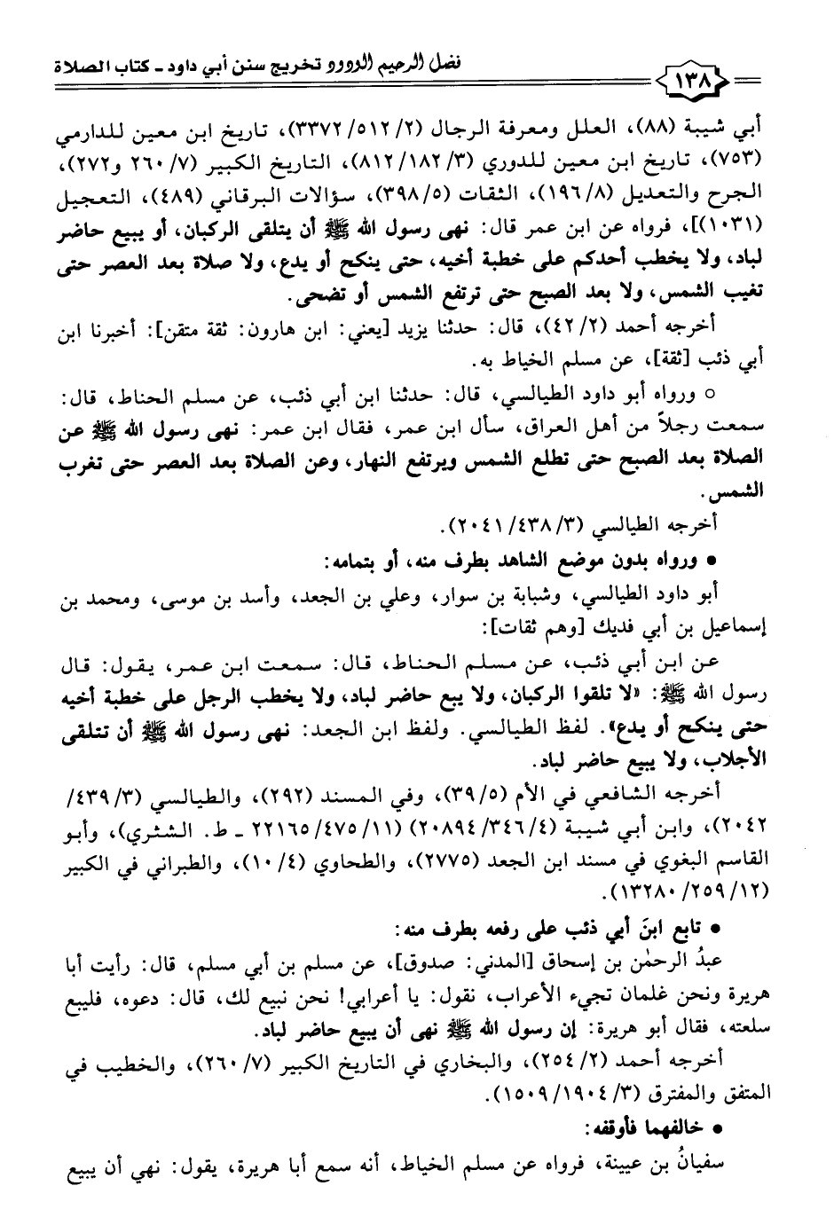 أبي شيبة (٨٨)، العلل ومعرفة الرجال (٢/ ٥١٢/ ٣٣٧٢)، تاريخ ابن معين للدارمي (٧٥٣)، تاريخ ابن معين للدوري (٣/ ١٨٢/ ٨١٢)، التاريخ الكبير (٧/ ٢٦٠ و ٢٧٢)، الجرح والتعديل (٨/ ١٩٦)، الثقات (٥/ ٣٩٨)، سؤالات البرقاني (٤٨٩)، التعجيل (١٠٣١)]، فرواه عن ابن عمر قال: نهى رسول الله -صلى الله عليه وسلم- أن يتلقى الركبان، أو يبيع حاضر لباد، ولا يخطب أحدكم على خطبة أخيه، حتى ينكح أو يدع، ولا صلاة بعد العصر حتى تغيب الشمس، ولا بعد الصبح حتى ترتفع الشمس أو تضحى.