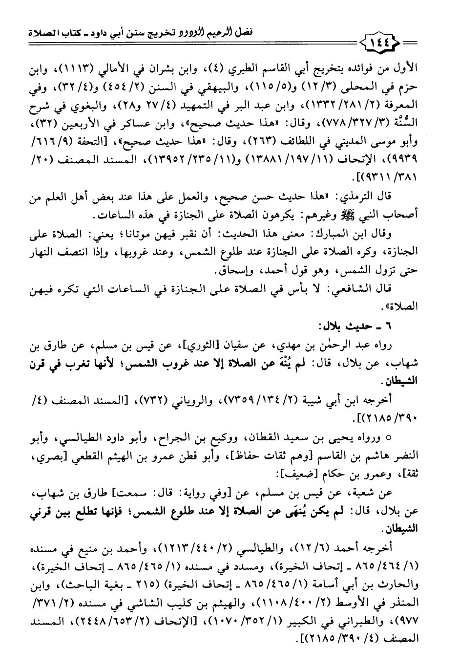 عن شعبة، عن قيس بن مسلم، عن [وفي رواية: قال: سمعت] طارق بن شهاب، عن بلال، قال: لم يكن يُنهَى عن الصلاة إلا عند طلوع الشمس؛ فإنها تطلع بين قرني الشيطان.