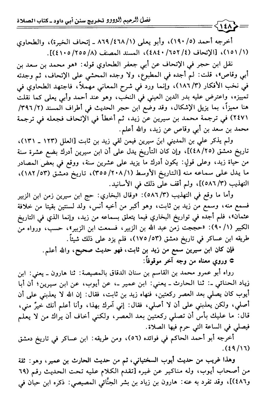 نقل ابن حجر في الإتحاف عن أبي جعفر الطحاوي قوله: "هو محمد بن سعد بن أبي وقاص"، قلت: لم أجده في المطبوع، ولا وجده المحشي على الإتحاف، ثم وجدته في نخب الأفكار (٣/ ١٨٦)، وإنما ورد في شرح المعاني مهملًا، فاجتهد الطحاوي في تمييزه، واعترض عليه بدر الدين العيني في النخب، وهو عند أحمد وأبي يعلى كما نقلت هنا مميزًا، بما يزيل الإشكال، وقد وضع ابن حجر الحديث في أطراف المسند (٢/ ٣٩٦/ ٢٤٧١) في ترجمة محمد بن سيرين عن زيد، ثم أخطأ في الإتحاف فجعله في ترجمة محمد بن سعد بن أبي وقاص عن زيد، والله أعلم.