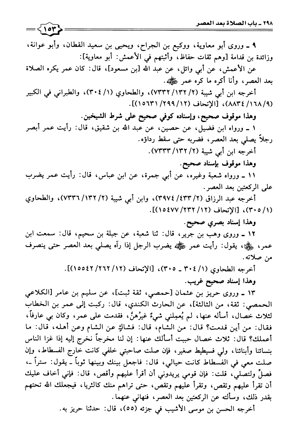 ١٢ - وروى وهب بن جرير، قال: ثنا شعبة، عن جبلة بن سحيم، قال: سمعت ابن عمر، -رضي الله عنهما-، يقول: رأيت عمر -رضي الله عنه- يضرب الرجل إذا رآه يصلي بعد العصر حتى ينصرف من صلاته.